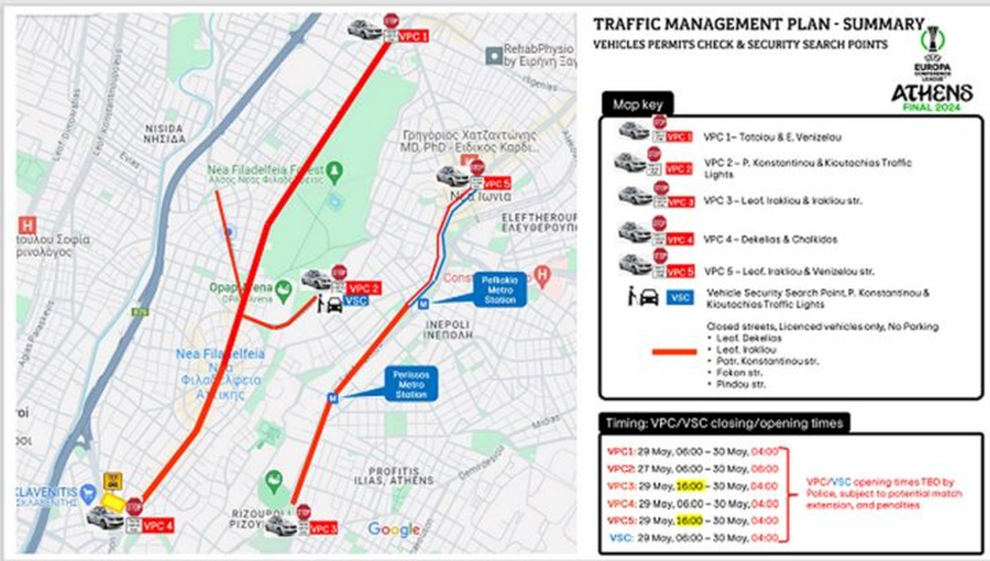 Μια σειρά κυκλοφοριακών ρυθμίσεων θα ισχύουν στις 29 Μαΐου στην Αθήνα λόγω της διεξαγωγής του τελικού του UEFA Europa Conference League. Οι αλλαγές θα αφορούν σε κυκλοφοριακές ρυθμίσεις κυρίως στην περιοχή της Νέας Φιλαδέλφειας.