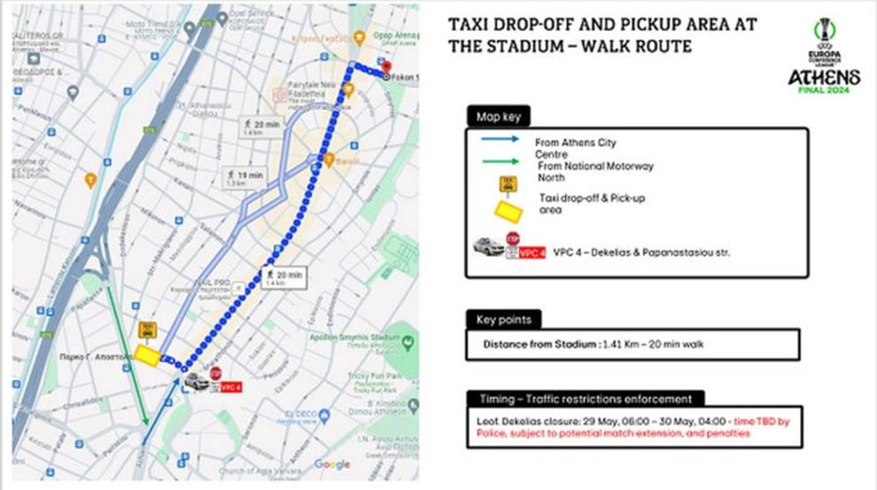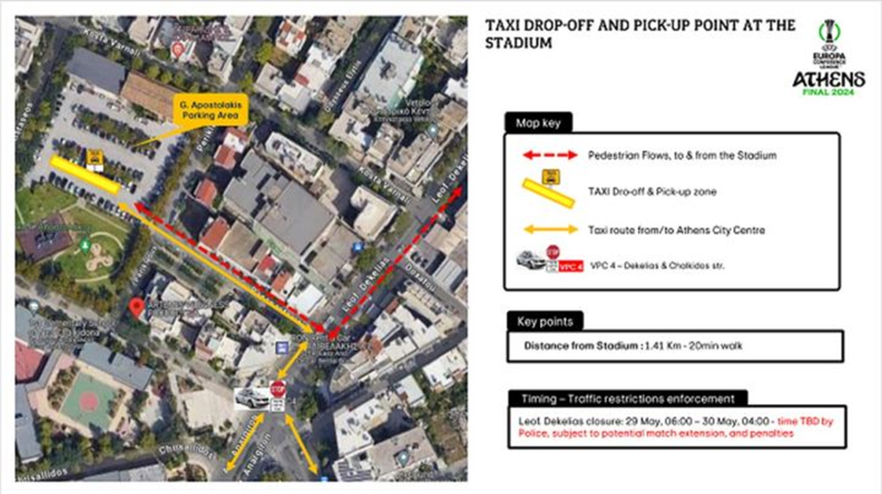 - Αυστηρές ρυθμίσεις σε ακτίνα 1 χιλιομέτρου πέριξ του γηπέδου διεξαγωγής του τελικού. Τα μέτρα θα περιλαμβάνουν απαγόρευση στάθμευσης και προσέγγισης του χώρου, με μέριμνα εξαιρέσεων για όσους χρήζουν βοήθειας, τις ευπαθείς ομάδες, τα άτομα με αναπηρία και μόνιμους κατοίκους.