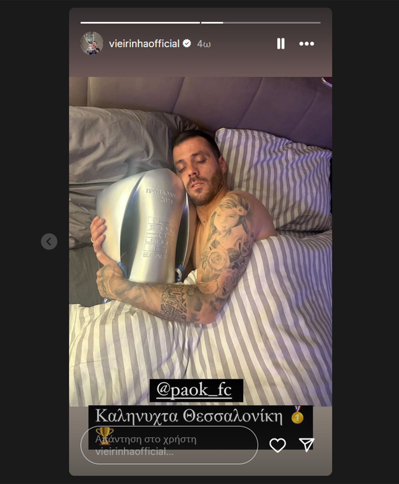 Μετά το ολονύχτιο πάρτι στον Λευκό Πύργο για την κατάκτηση του πρωταθλήματος από τον ΠΑΟΚ, το τρόπαιο κατέληξε στην αγκαλιά του Αντρέ Βιεϊρίνια, με τον αρχηγό του Δικεφάλου να κοιμάται μαζί του, ποστάροντας μία φωτογραφία στα social media: «Καληνύχτα Θεσσαλονίκη».