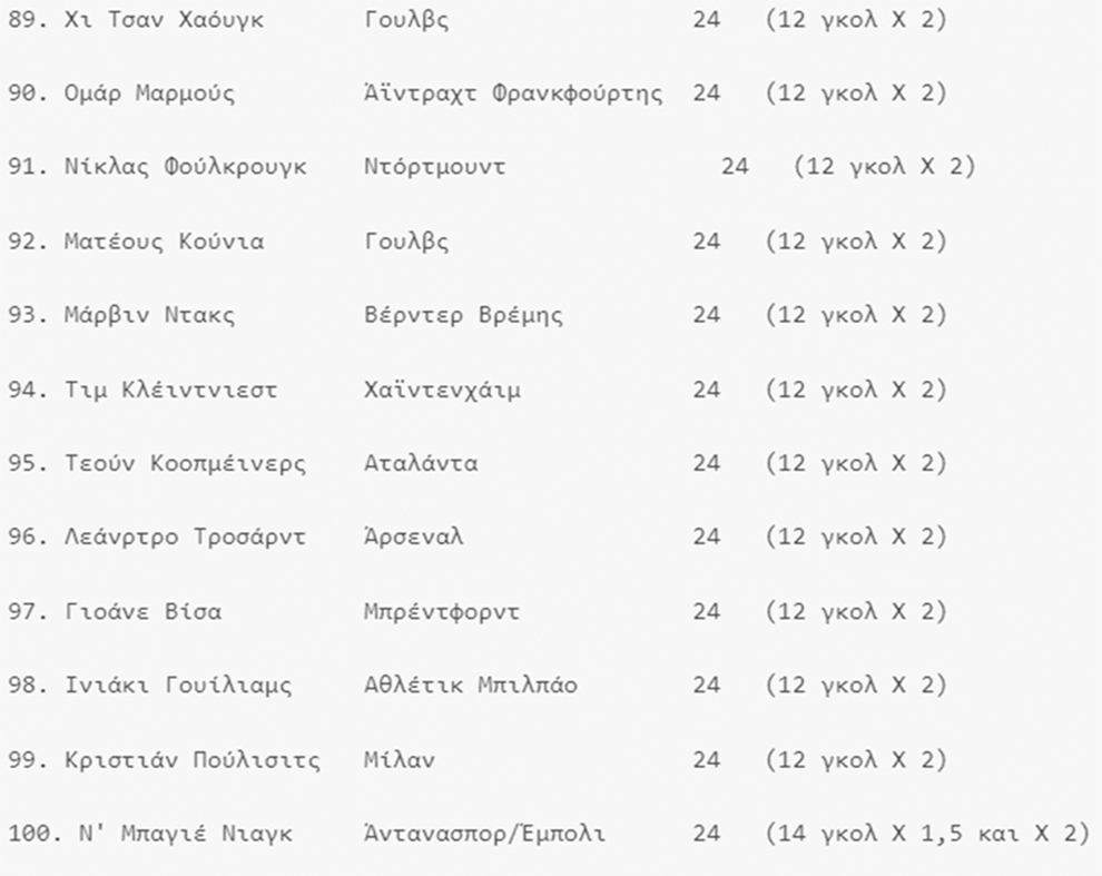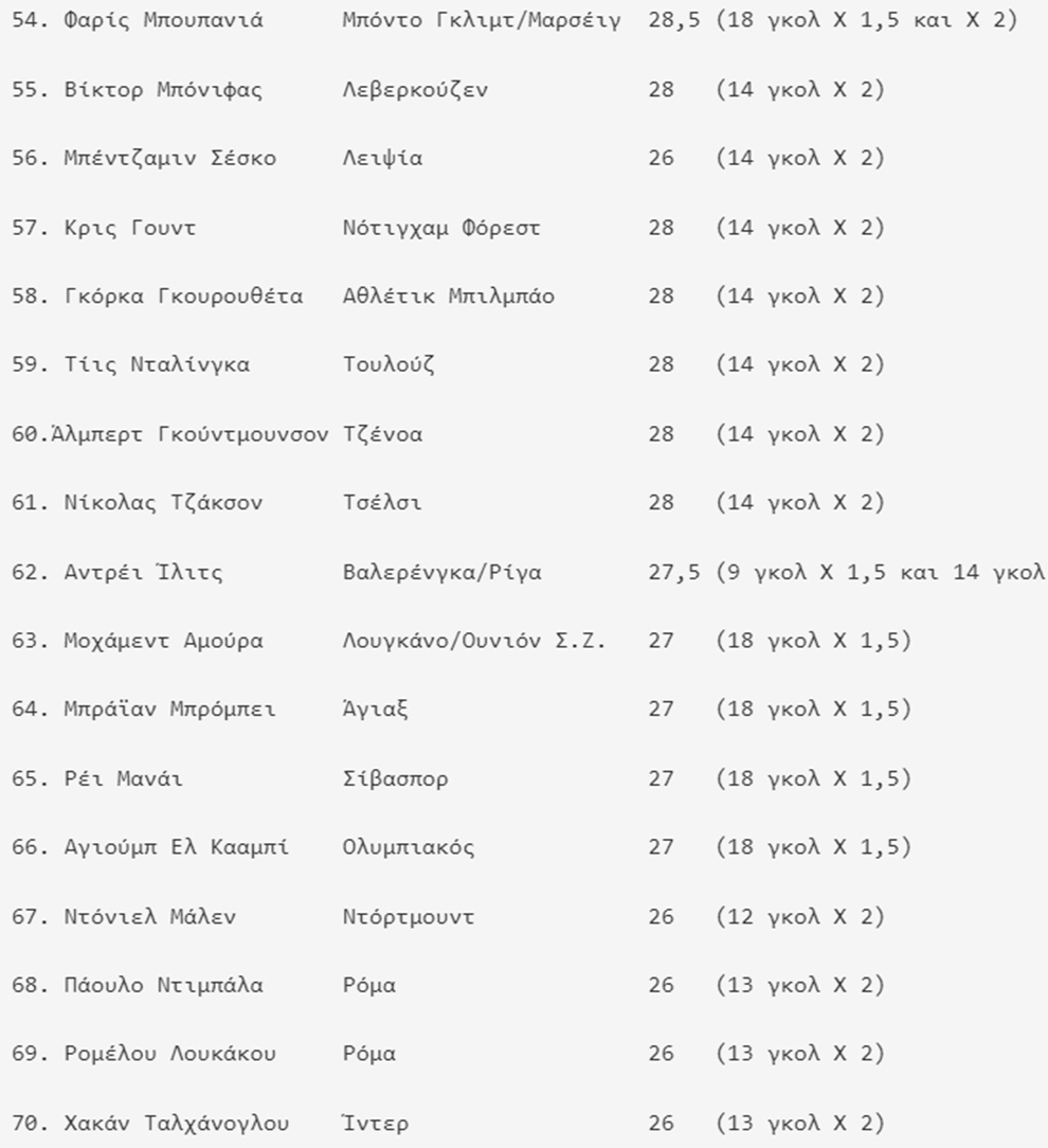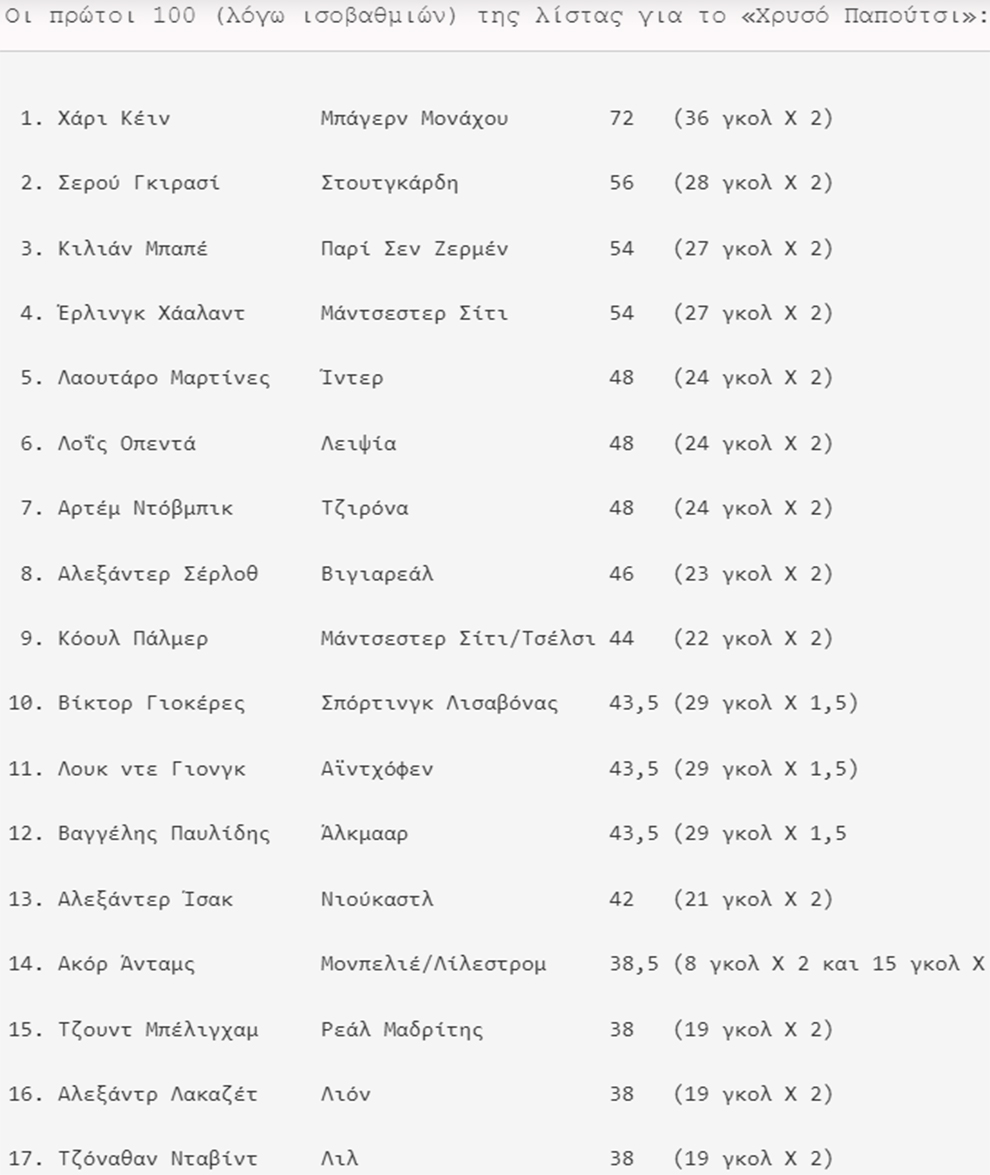 Οι πρώτοι 100 (λόγω ισοβαθμιών) της λίστας για το «Χρυσό Παπούτσι»: