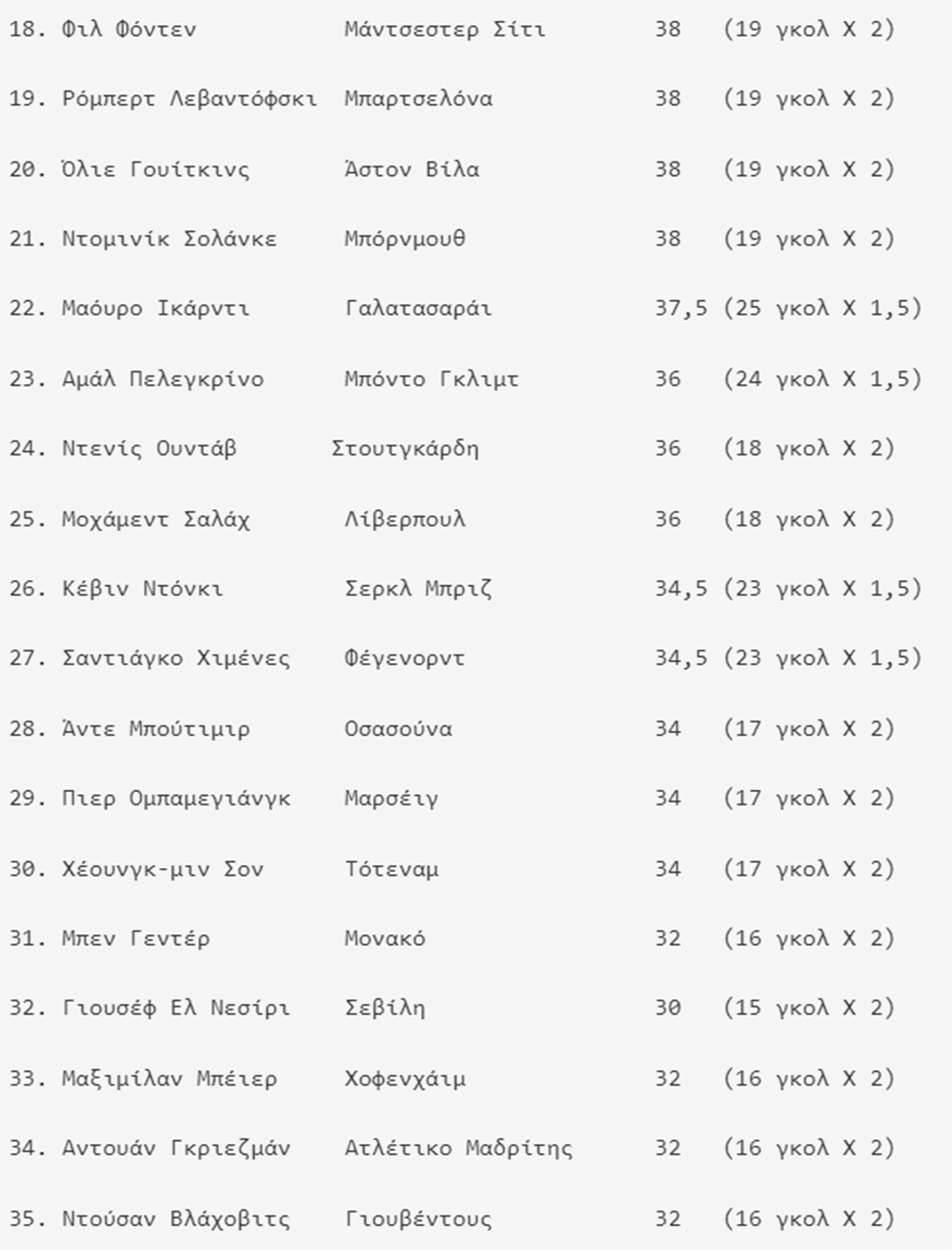 Τους δύο ακολουθεί ο Αργεντινός επιθετικός της Ίντερ Λαουτάρο Μαρτίνες (Ίντερ), ο Λοΐς Οπεντά (Λειψία) και ο Αρτέμ Ντόβμπικ της Τζιρόνα με 24 γκολ και 48 βαθμούς ο καθένας.