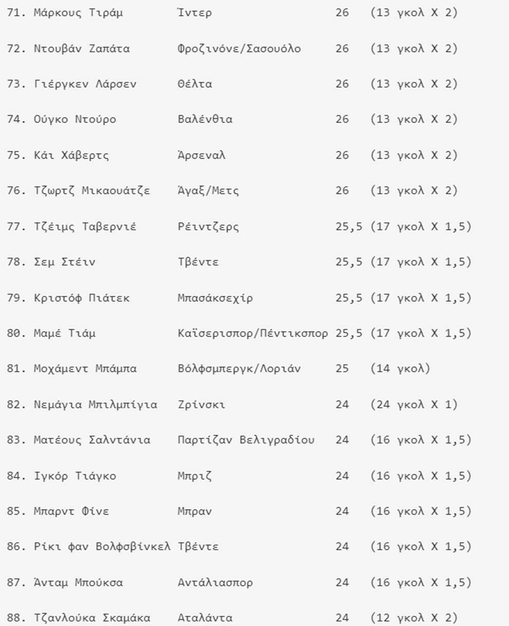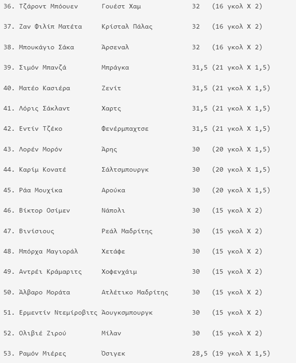 Στην 8η θέση είναι ο Αλεξάντερ Σέρλοθ (Βιγιαρεάλ) με 23 γκολ και 46 βαθμούς, μπροστά από τον Κόουλ Πάλμερ (Τσέλσι/22 γκολ και 44 βαθμοί). Τρεις παίκτες, ανάμεσά τους και ο Βαγγέλης Παυλίδης έχουν από 29 γκολ και 43,5 βαθμούς: ο επιθετικός της Σπόρτινγκ Λισαβόνας Βίκτορ Γκιοκέρες και ο Λουκ ντε Γιονγκ (Αϊντχόφεν), οι άλλοι δύο.
