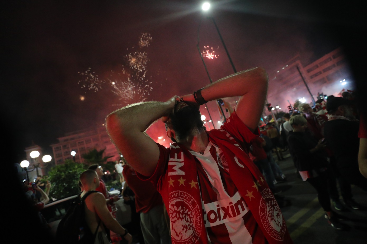 Ο Πειραιάς φλέγεται με χιλιάδες οπαδούς να πανηγυρίζουν την ιστορική νίκη του Ολυμπιακού απέναντι στη Φιορεντίνα το βράδυ της Τετάρτης που οδήγησε στην κατάκτηση του Europa Conference League.