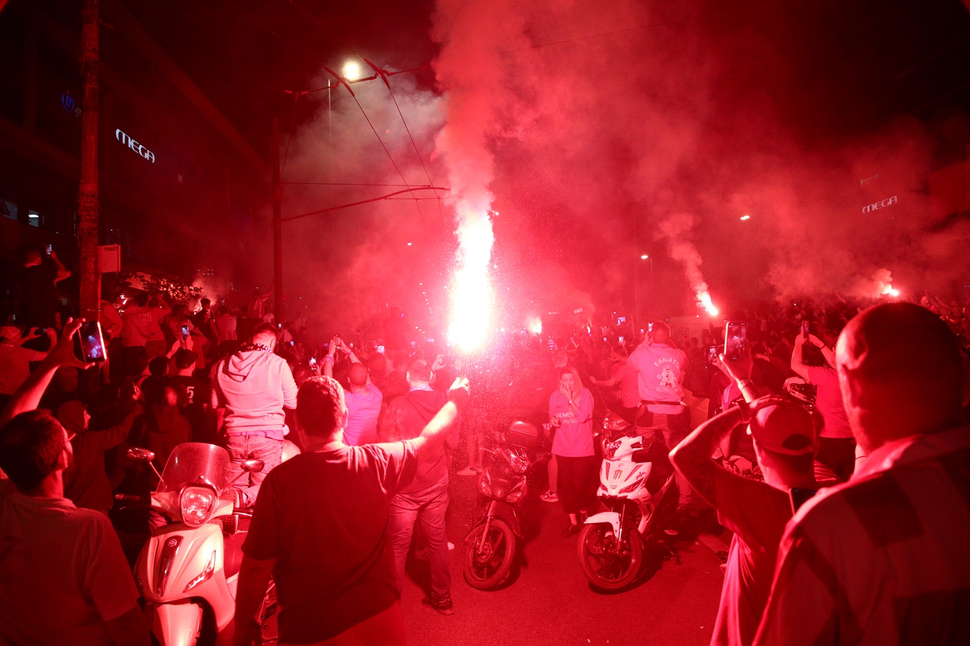 Χιλιάδες φιλάθλοι του Θρύλου συνοδεύουν την αγαπημένη τους ομάδα και πανηγυρίζουν μαζί τους με κόρνες, συνθήματα, χορούς και καπνογόνα.