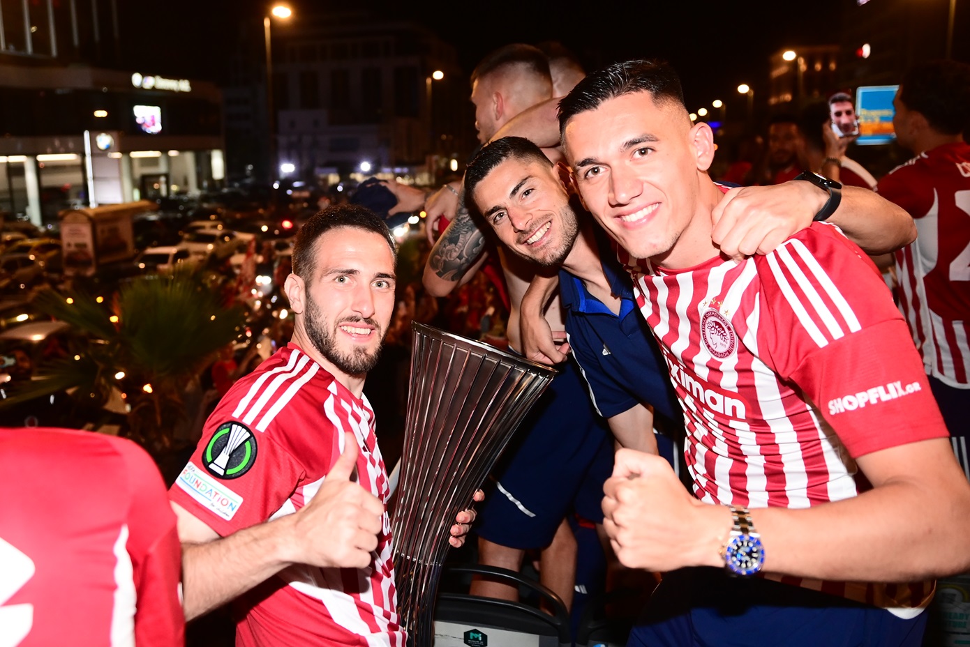 Οι πρωταθλητές Ευρώπης κατευθύνονται προς στο Δημοτικό Θέατρο Πειραιά μετά τη νίκη επί της Φιορεντίνα στον τελικό του Europa Conference League όπου εκεί θα τους υποδεχτούν χιλιάδες οπαδοί τους.