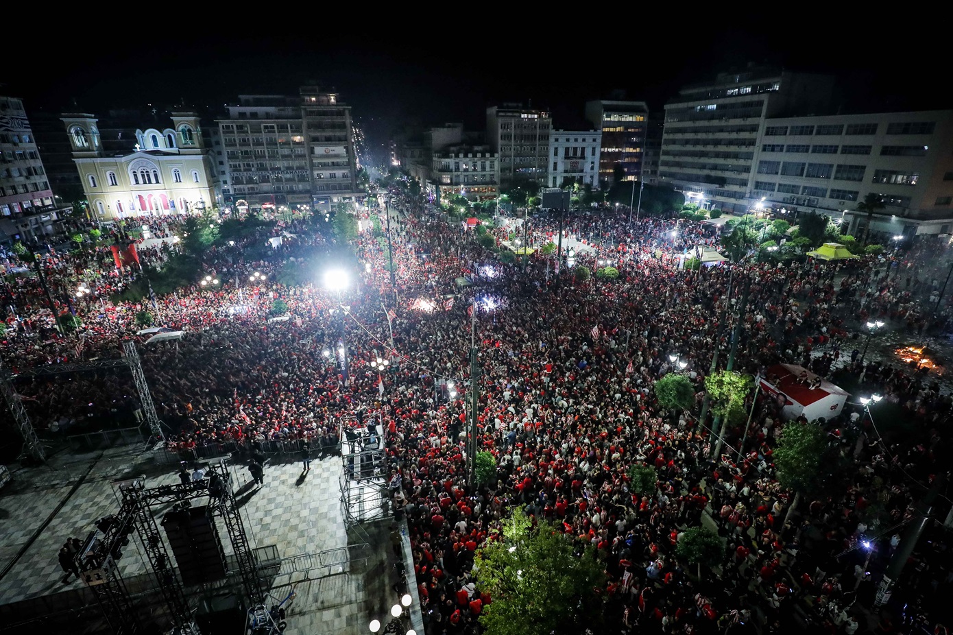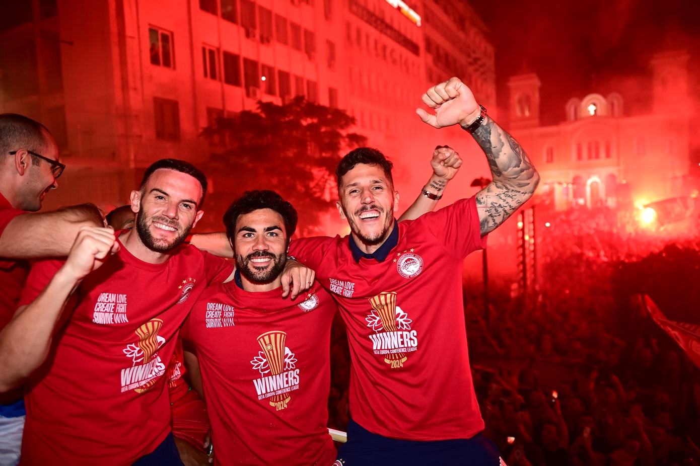 Οι οπαδοί αποθεώνουν τους παίκτες της ερυθρόλευκης ομάδας που τη συνόδεψαν από τη Φιλαδέλφεια προς τον Πειραιά με το ανοιχτό διώροφο λεωφορείο.