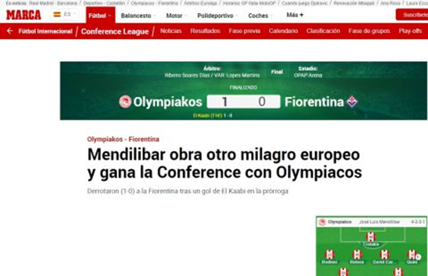 Marca (Ισπανία): «Ο Μεντιλίμπαρ έκανε άλλο ένα ευρωπαϊκό θαύμα και κατέκτησε το Conference με τον Ολυμπιακό».