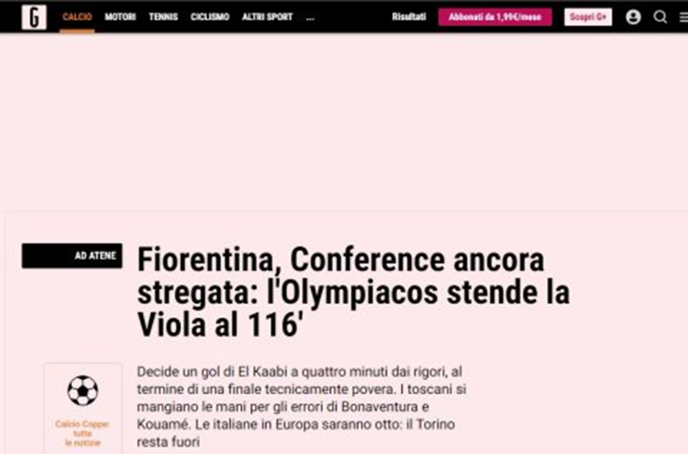 Gazzetta dello Sport (Ιταλία): «Η Φιορεντίνα παραμένει καταραμένη: Ο Ολυμπιακός έριξε νοκ άουτ τους Βιόλα στο 116’».