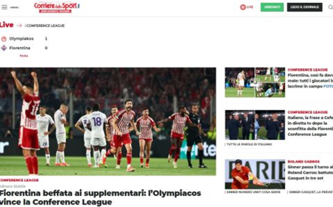 Corriere dello Sport (Ιταλία): «Η Φιορεντίνα την πάτησε στην παράταση: Ο Ολυμπιακός κατέκτησε το Conference League».