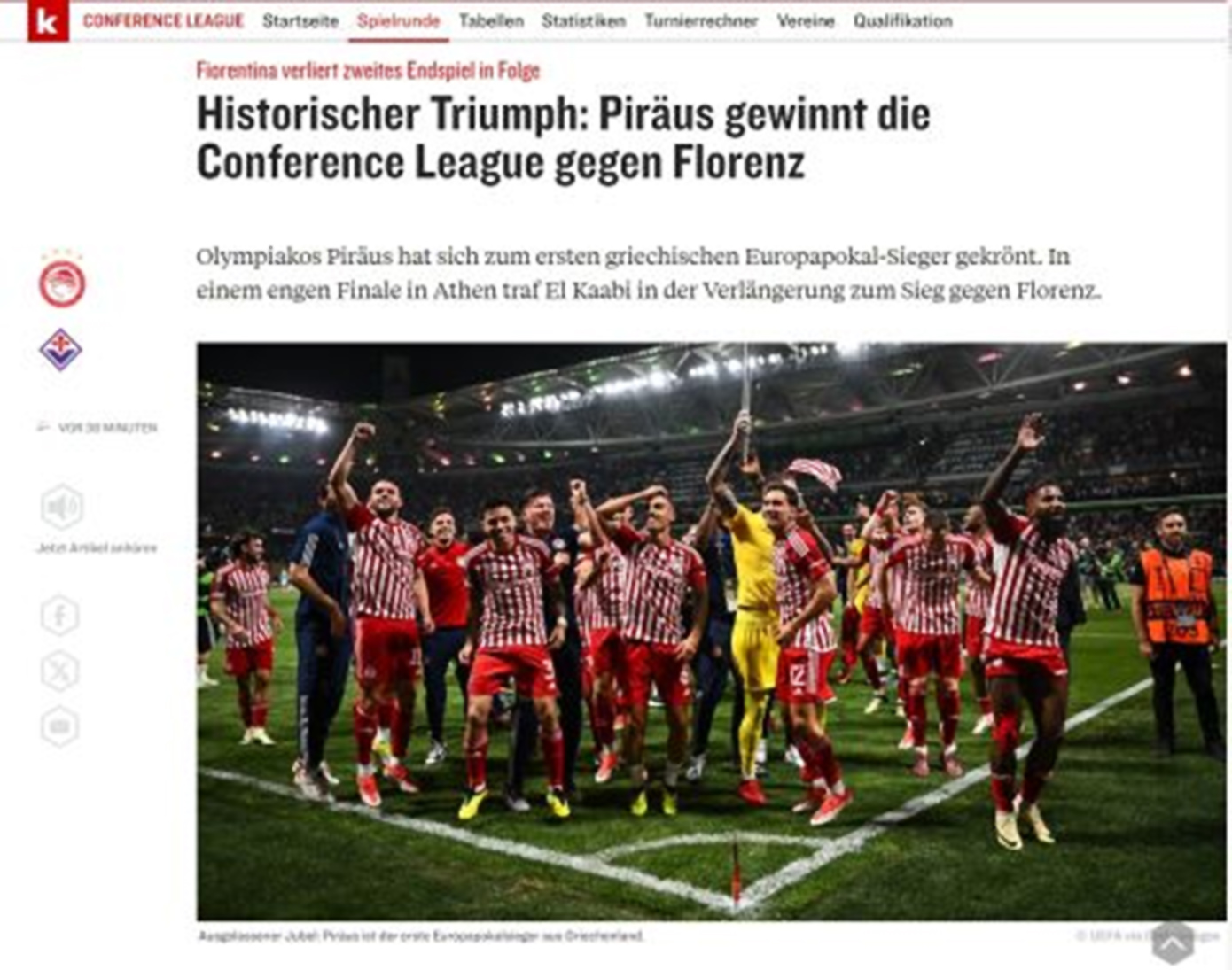 Kicker (Γερμανία): «Ιστορικός θρίαμβος: Ο Ολυμπιακός κατέκτησε το Conference League κόντρα στη Φιορεντίνα».