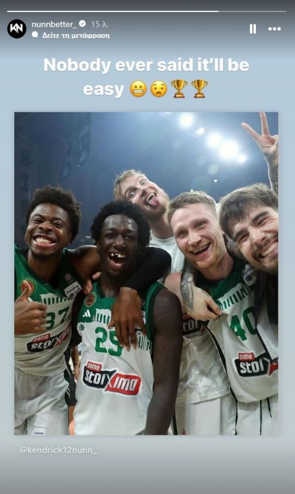 Έτσι, ανέβασε μια φωτογραφία στην οποία πανηγυρίζει -έστω με τρία δόντια λιγότερα λόγω της ακούσιας αγκωνιάς από τον συμπαίκτη Τζέριαν Γκραντ- μαζί με τους Αντετοκούνμπο, Χουάντσο, Γκριγκόνις και Μπαλτσερόφσκι γράφοντας «κανείς δεν είπε ότι θα είναι εύκολο».