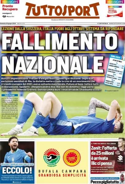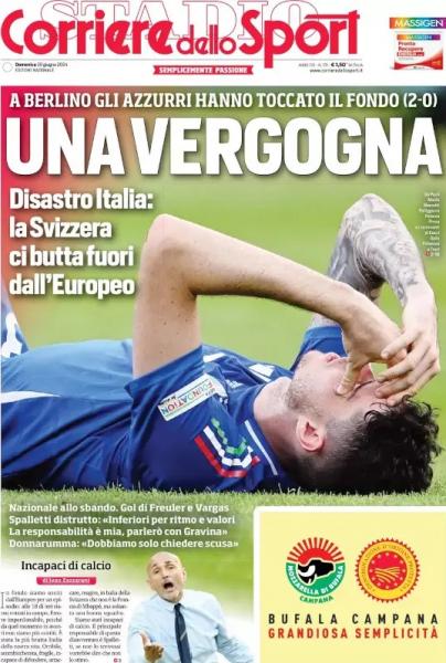 «Ντροπή! Πιάσαμε πάτο στο Βερολίνο. Καταστροφή για την Ιταλία, η Ελβετία μάς πέταξε έξω από το Euro», ενώ η Tuttosport συνεχίζει: «Εθνική αποτυχία! Σκληρό μάθημα από την Ελβετία και έξω από το Euro! Όλο το σύστημα χρειάζεται αλλαγή! Μετά την απουσία από δύο σερί Μουντιάλ, η νέα αυτή αποτυχία έρχεται για να αναδείξει την κρίση που είχε καμουφλάρει η κατάκτηση του Euro το 2021. Το μέλλον είναι κατάμαυρο για την Ιταλία. Όλοι είναι υπό αμφισβήτηση» γράφει η Corriere dello Sport.