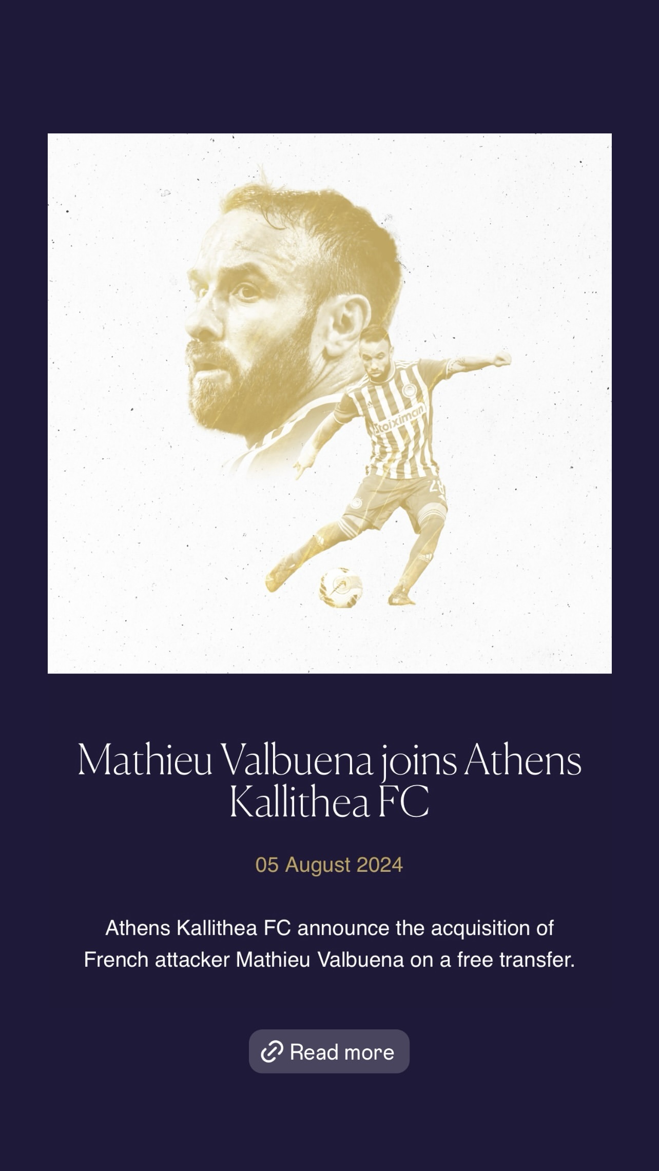 «Η Athens Kallithea FC ανακοινώνει την απόκτηση του Γάλλου επιθετικού Mathieu Valbuena με ελεύθερη μεταγραφή.