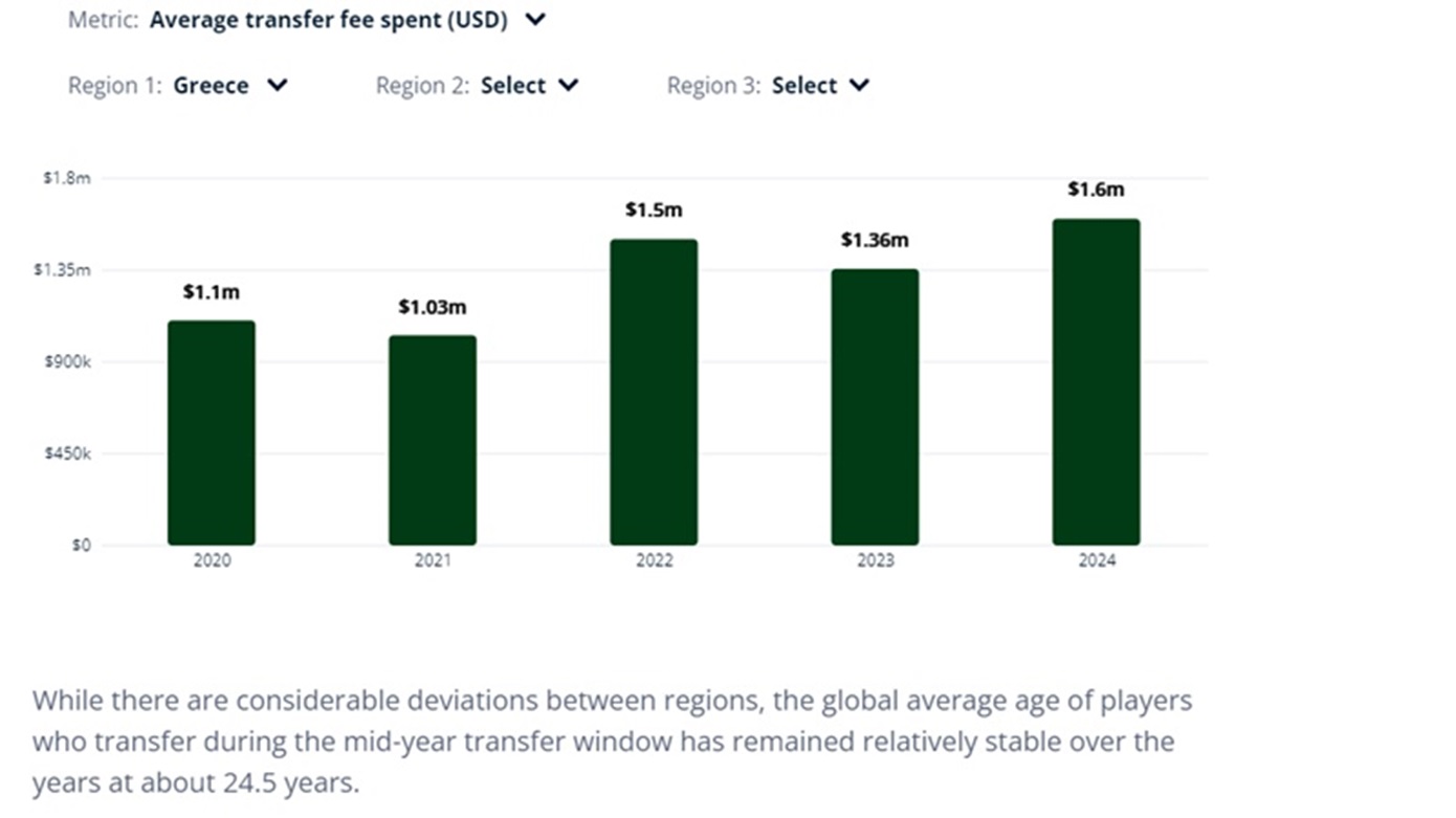Ο μέσος όσος τω χρημάτων που ξοδεύτηκε έφτασε στο ρεκόρ-για την ελληνική Super League- των 1,6 εκατομμυρίων δολαρίων ανά μεταγραφή, έναντι 1,36 εκατ. δολαρίων το 2023, , 1,5 το 2022, 1,03 το 2021 και 1,1 εκατομμύρια δολάρια το 2020.