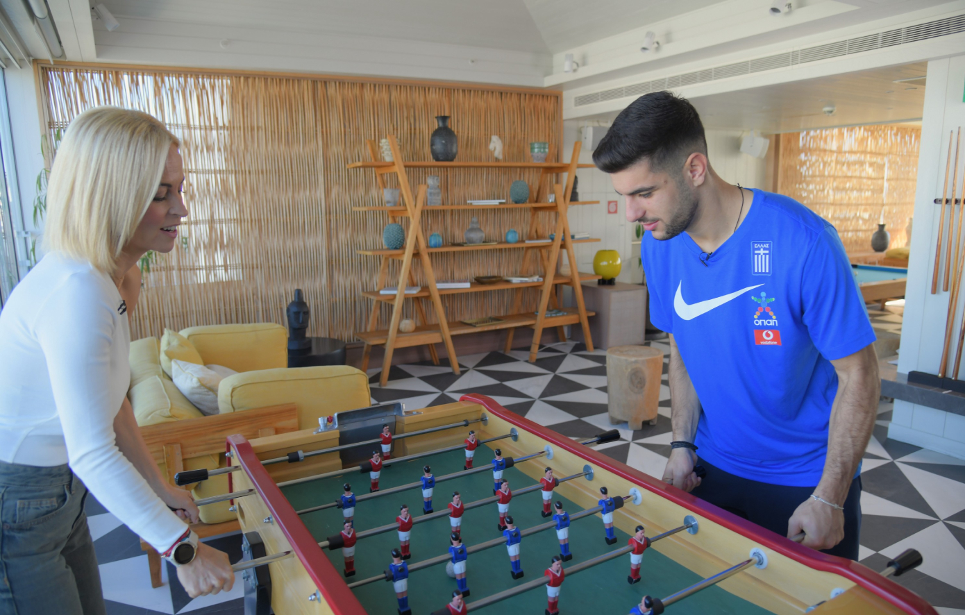 Η εκπομπή πραγματοποιήθηκε στο ξενοδοχείο της Εθνικής Ομάδας και η Μαρία Ζαφειράτου αντιμετώπισε τον άσο της Εθνικής μας ομάδας στο παραδοσιακό ξύλινο «ποδοσφαιράκι».