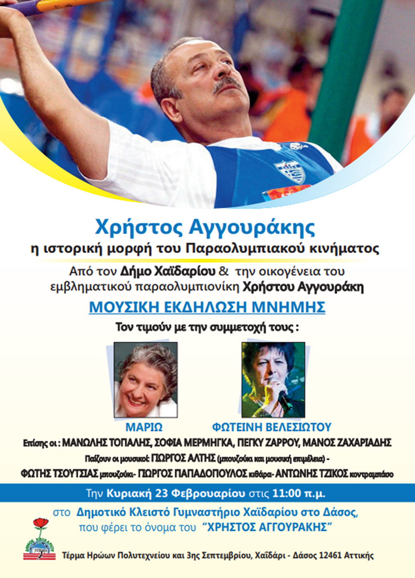 Εκδήλωση μνήμης θα πραγματοποιηθεί την Κυριακή 23 Φεβρουαρίου για την ιστορική μορφή του Παραολυμπιακού κινήματος, τον Χρήστο Αγγουράκη, ο οποίος έφυγε από τη ζωή πριν από τρία χρόνια σε ηλικία 70 ετών.
