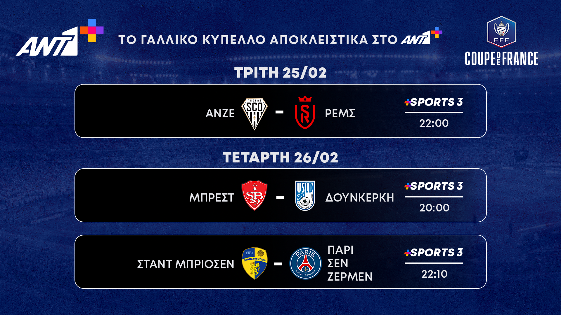 Το ANT1+ (antennaplus.gr) ανεβάζει την ένταση και φέρνει στους συνδρομητές του τις κορυφαίες αναμετρήσεις από τα Κύπελλα Γερμανίας (DFB Pokal), Γαλλίας (Coupe de France) και Ολλανδίας (KNVB Beker)! Από τις 25 έως τις 27 Φεβρουαρίου, οι ομάδες ρίχνονται στη μάχη της πρόκρισης σε ένα τριήμερο γεμάτο ποδοσφαιρικές συγκινήσεις. Το Κύπελλο Γαλλίας μπαίνει στην τελική του ευθεία με δύο σπουδαία νοκ-άουτ παιχνίδια, ενώ η δράση κορυφώνεται στο Κύπελο Γερμανίας, με ακόμα έναν δυνατό προημιτελικό! Το Κύπελλο Ολλανδίας ρίχνει την αυλαία με μια αναμέτρηση που κόβει την ανάσα. Επίσης, στο ΑΝΤ1+ κάθε Πέμπτη, συνεχίζει το καθιερωμένο ραντεβού με τους αγώνες του UEFA Europa League και UEFA Europa Conference League.