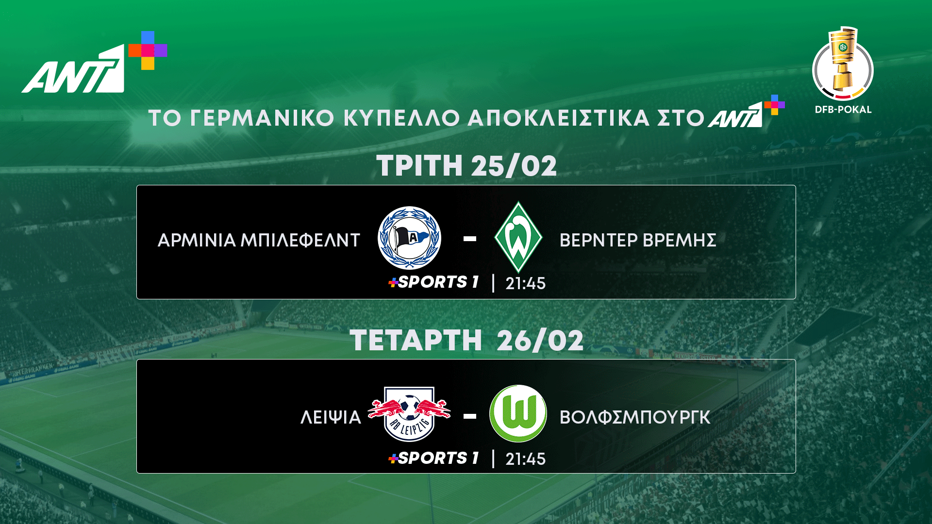 Το Κύπελλο Γερμανίας (DFB Pokal), μπαίνει στην τελική ευθεία και η αγωνία κορυφώνεται. Η Στουτγκάρδη και η Λεβερκούζεν έχουν ήδη σφραγίσει το εισιτήριό τους για τους «4» και περιμένουν να μάθουν τους αντιπάλους τους. Η Αρμίνια Μπίλεφελντ, η μεγάλη έκπληξη της διοργάνωσης από την τρίτη κατηγορία, συνεχίζει να γράφει ιστορία! Μετά τον θρίαμβο απέναντι στη Φράιμπουργκ, ετοιμάζεται για μια ακόμα μεγάλη πρόκληση απέναντι στη Βέρντερ Βρέμης. Στην άλλη αναμέτρηση, η Λειψία του Τσάβι Σίμονς διασταυρώνει τα ξίφη της με τη Βόλφσμπουργκ, όπου ξεχωρίζει η παρουσία του Κωνσταντίνου Κουλιεράκη.