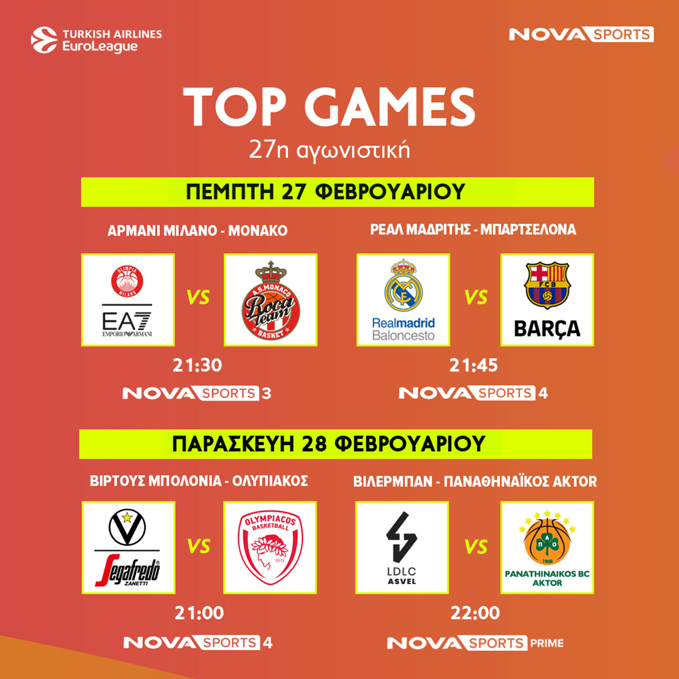 Η EuroLeague η κορυφαία ευρωπαϊκή διασυλλογική διοργάνωση στο χώρο του μπάσκετ, επιστρέφει στην αγωνιστική δράση μετά από διακοπή δύο εβδομάδων και οι συνδρομητές της Nova ετοιμάζονται να απολαύσουν τις αναμετρήσεις της 27ς αγωνιστικής Βίρτους Μπολόνια – Ολυμπιακός (28/2, 21:00), Βιλερμπάν – Παναθηναϊκός AKTOR (28/2, 22:00).