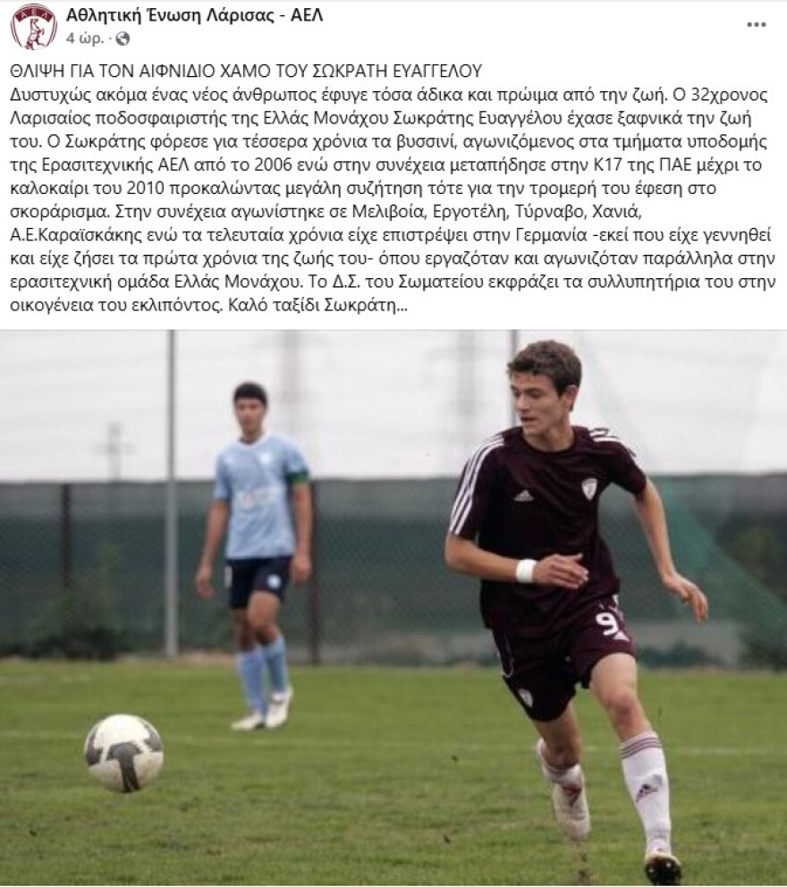 Δυστυχώς ακόμα ένας νέος άνθρωπος έφυγε τόσα άδικα και πρώιμα από την ζωή. Ο 32χρονος Λαρισαίος ποδοσφαιριστής της Ελλάς Μονάχου Σωκράτης Ευαγγέλου έχασε ξαφνικά την ζωή του.