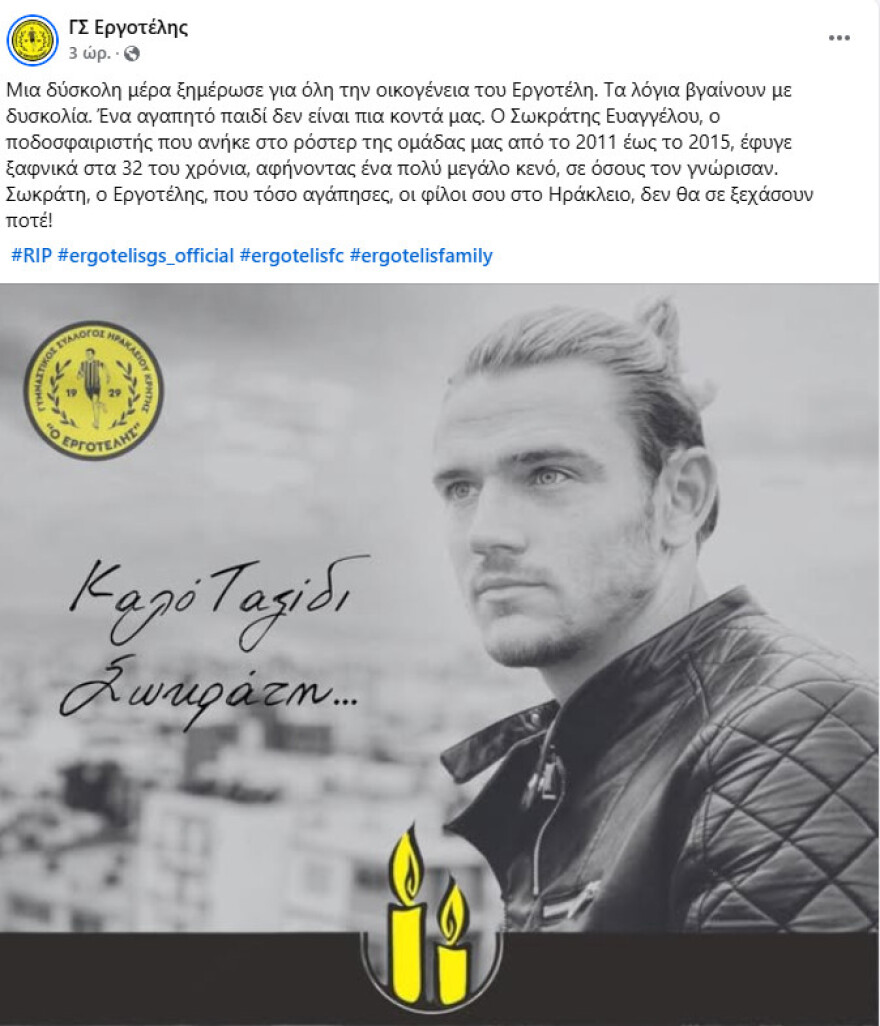 Μια δύσκολη μέρα ξημέρωσε για όλη την οικογένεια του Εργοτέλη. Τα λόγια βγαίνουν με δυσκολία. Ένα αγαπητό παιδί δεν είναι πια κοντά μας. Ο Σωκράτης Ευαγγέλου, ο ποδοσφαιριστής που ανήκε στο ρόστερ της ομάδας μας από το 2011 έως το 2015, έφυγε ξαφνικά στα 32 του χρόνια, αφήνοντας ένα πολύ μεγάλο κενό, σε όσους τον γνώρισαν.