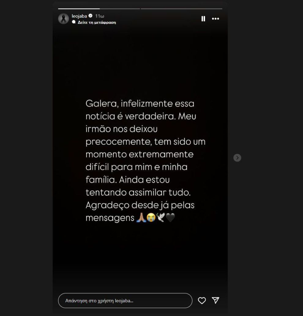 «Παιδιά, δυστυχώς αυτά τα νέα είναι αλήθεια. Ο αδερφός μου μας άφησε νωρίς και είναι μια εξαιρετικά δύσκολη περίοδος για μένα και την οικογένειά μου. Ακόμα προσπαθώ να αφομοιώσω τα πάντα. Ευχαριστώ εκ των προτέρων για τα μηνύματα», ανέφερε χαρακτηριστικά ο Ζαμπά.