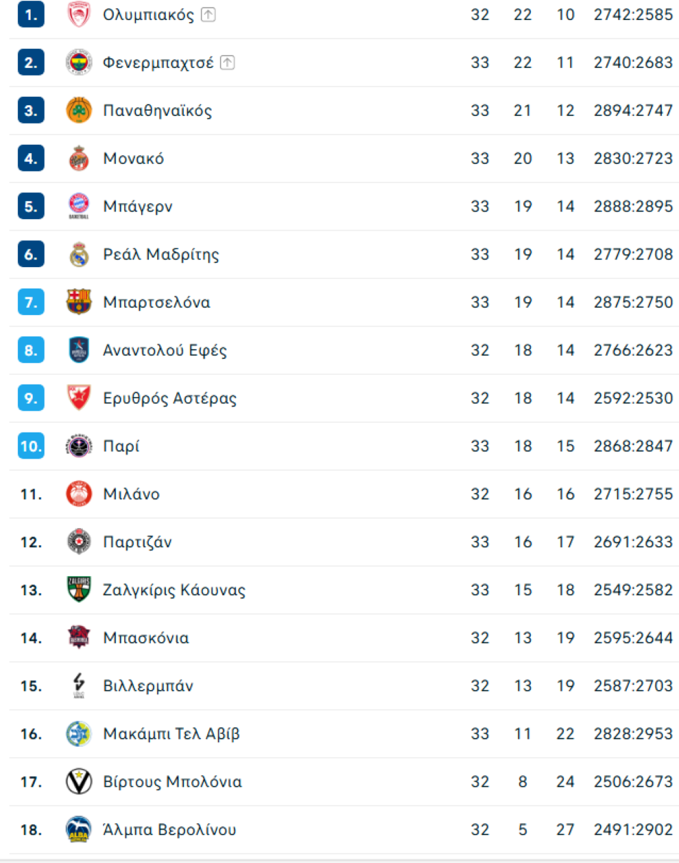 Η regular season της Euroleague βρίσκεται στην τελική ευθεία, το πρώτο μισό της 33ης αγωνιστικής ολοκληρώθηκε και στη βαθμολογία γίνεται το έλα να δεις!
