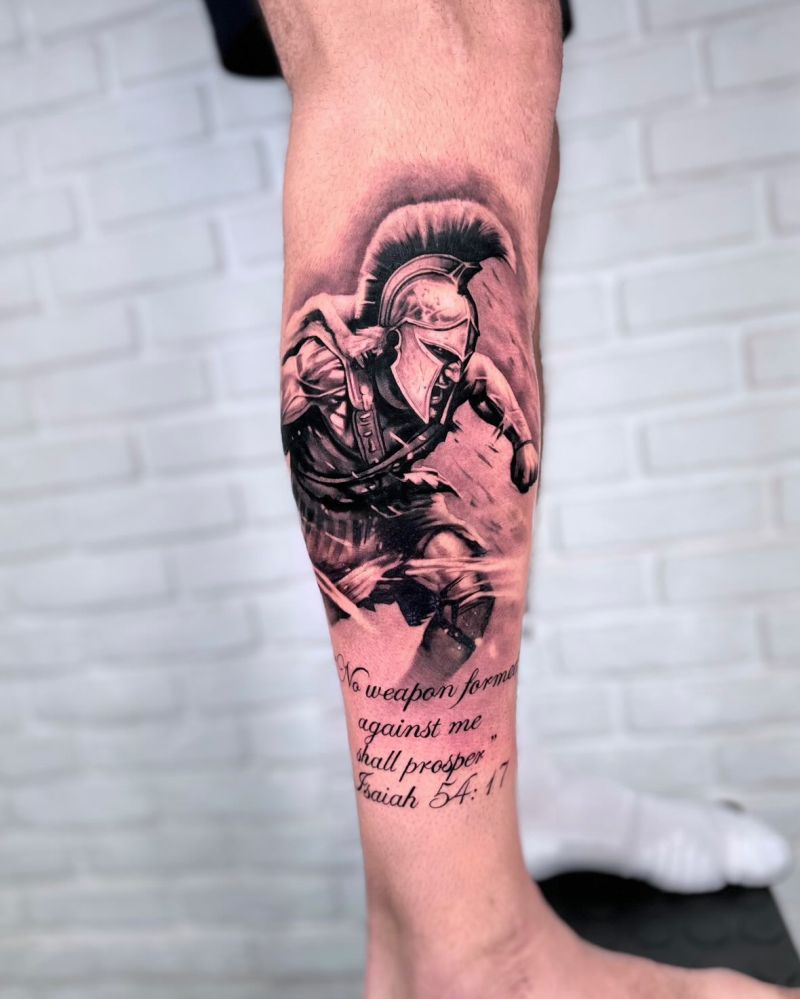 Τον αρχαίο Έλληνα πολεμιστή συνόδευσε με ένα εδάφιο από την Παλαιά Διαθήκη: Το εδάφιο Ησαΐας 54:17 (Isaiah 54:17)στη μετάφραση του Βασιλέως Ιακώβου (King James Version) αποδίδεται ως εξής: