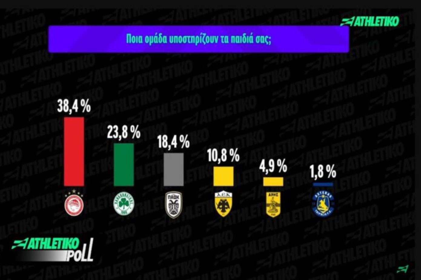 Το μεγάλο ενδιαφέρον όμως υπάρχει στην ερώτηση για το τί ομάδα υποστηρίζουν τα νέα παιδιά, με τον Ολυμπιακό να… θριαμβεύει σε αυτήν την κατηγορία, με 38,4%.