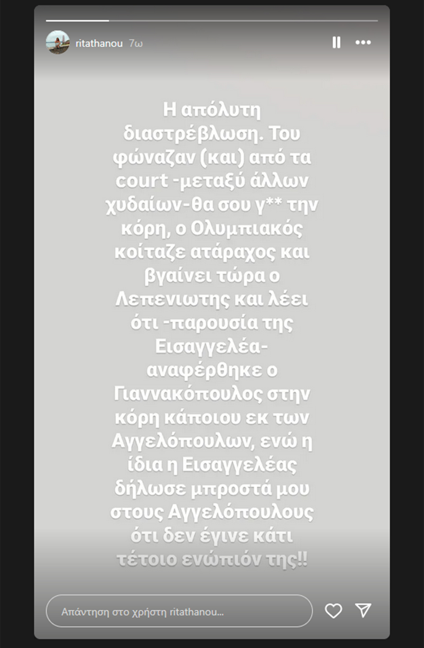«Η απόλυτη διαστρέβλωση. Του φώναζαν (και) από τα court -μεταξύ άλλων χυδαίων- θα σου γ… την κόρη. Ο Ολυμπιακός κοίταζε ατάραχος και βγαίνει τώρα ο Λεπενιώτης και λέει ότι -παρουσία της Εισαγγελέα- αναφέρθηκε ο Γιαννακόπουλος στην κόρη κάποιου εκ των Αγγελόπουλων, ενώ η ίδια η Εισαγγελέας δήλωσε μπροστά μου στους Αγγελόπουλους ότι δεν έγινε κάτι τέτοιο ενώπιόν της».