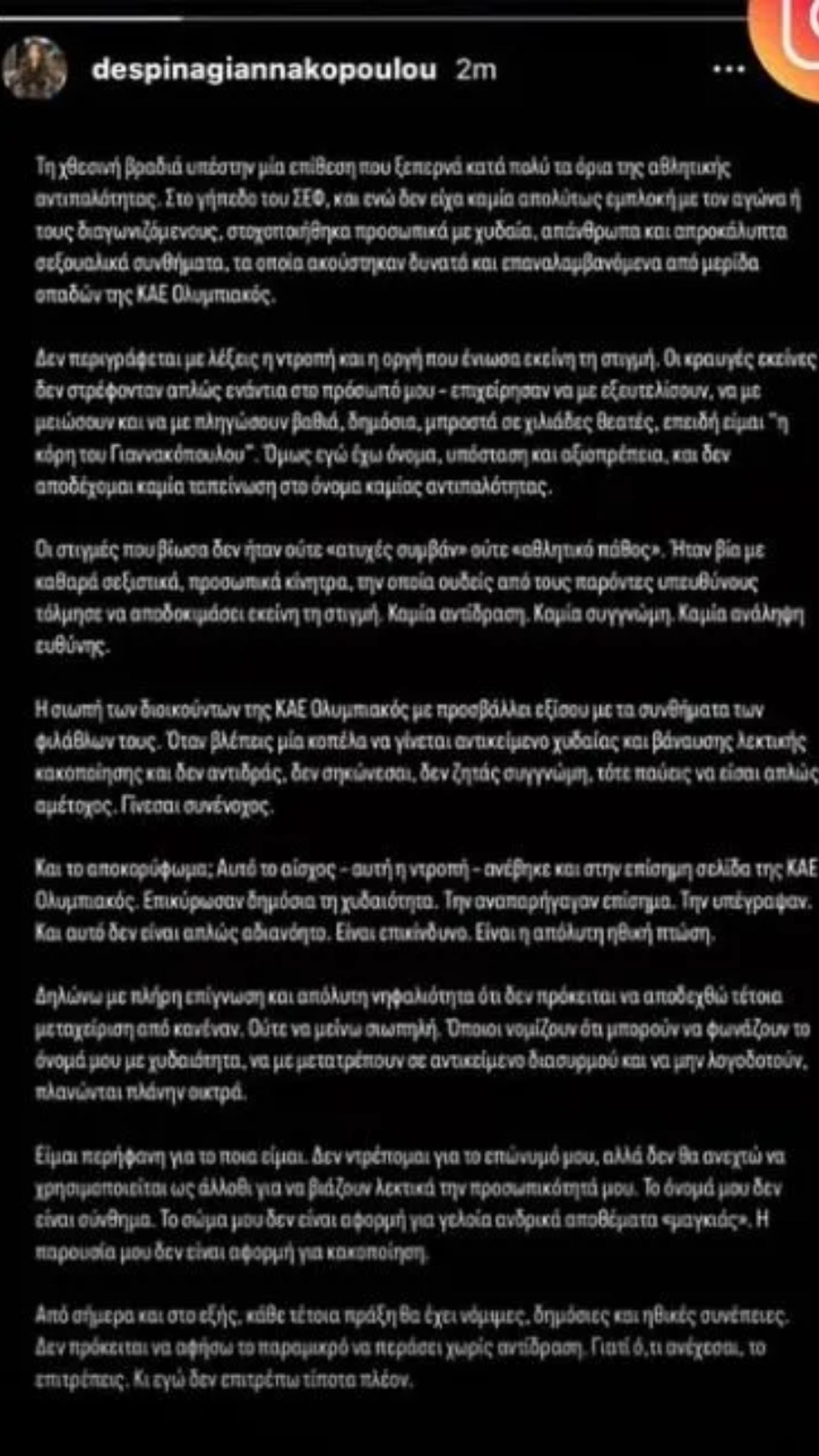 «Στο γήπεδο του ΣΕΦ, και ενώ δεν είχα καμία απολύτως εμπλοκή με τον αγώνα ή τους διαγωνιζόμενους, στοχοποιήθηκα προσωπικά με χυδαία, απάνθρωπα και απροκάλυπτα σεξιστικά συνθήματα, τα οποία ακούστηκαν δυνατά και επαναλαμβανόμενα από μερίδα οπαδών της ΚΑΕ Ολυμπιακός», επεσήμανε, μεταξύ άλλων, η Δέσποινα Γιαννακοπούλου στην ανακοίνωσή της.