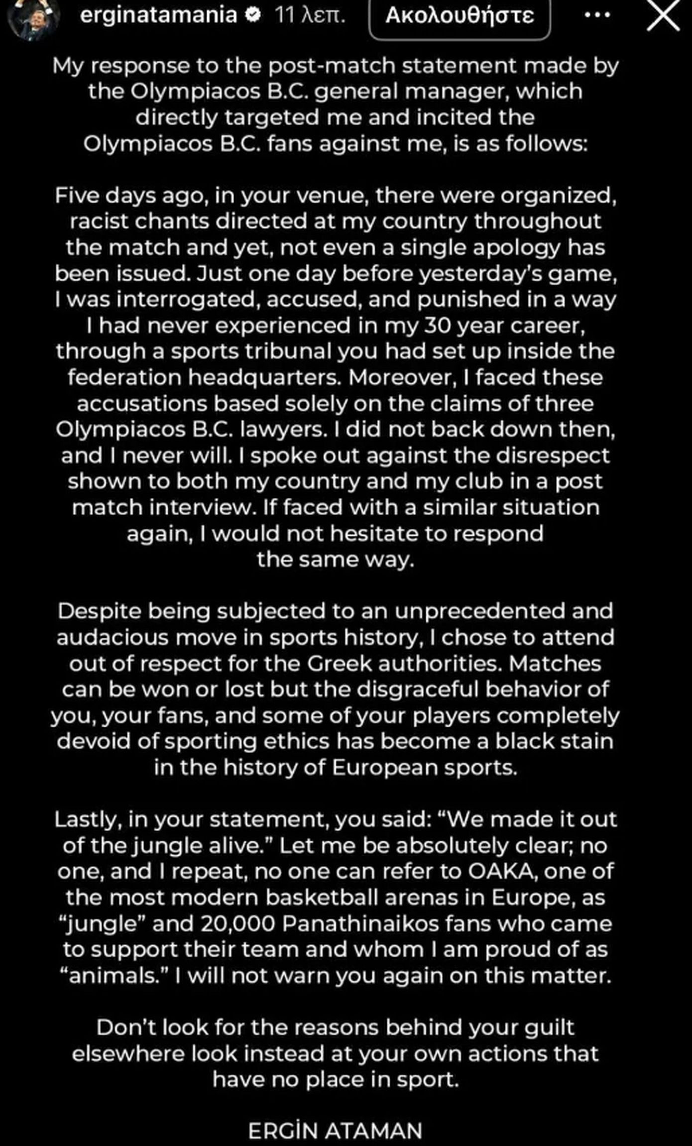 Με story στον προσωπικό του λογαριασμό στο Instagram ο Εργκίν Αταμάν ανέφερε:
