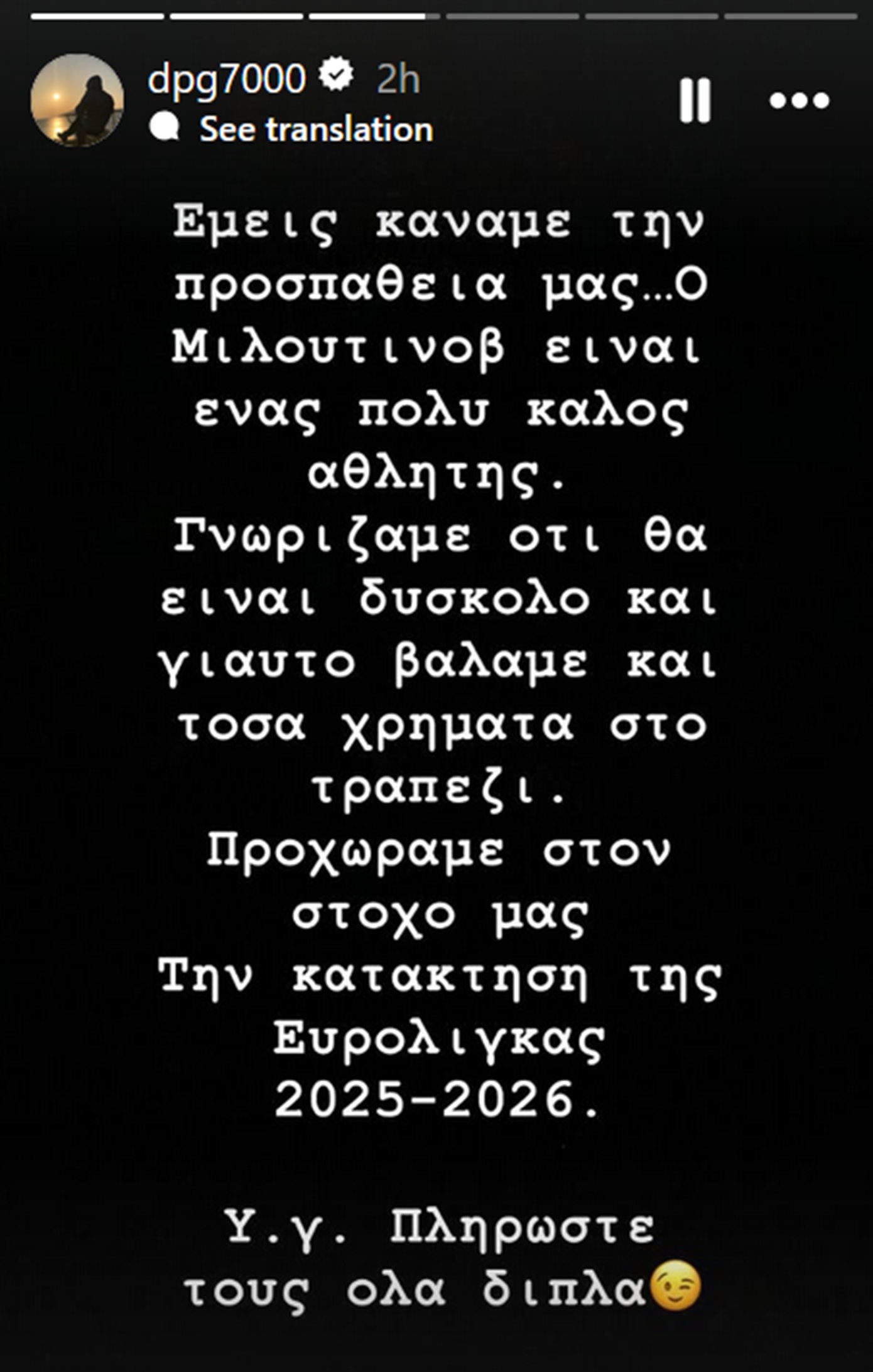 «Εμείς κάναμε την προσπάθειά μας… Ο Μιλουτίνοφ είναι ένας πολύ καλός αθλητής. Γνωρίζαμε ότι θα είναι δύσκολο και γι’ αυτό βάλαμε και τόσα χρήματα στο τραπέζι. Προχωράμε στον στόχο μας, την κατάκτηση της Ευρωλίγκα 2025-26. Υ.γ.: Πληρώστε τους όλα διπλά» έγραψε σε στόρι του ο ιδιοκτήτης του Παναθηναϊκού επιβεβαιώνοντας έτσι το ενδιαφέρον της ομάδας του για τον παίκτη των Ερυθρόλευκων.