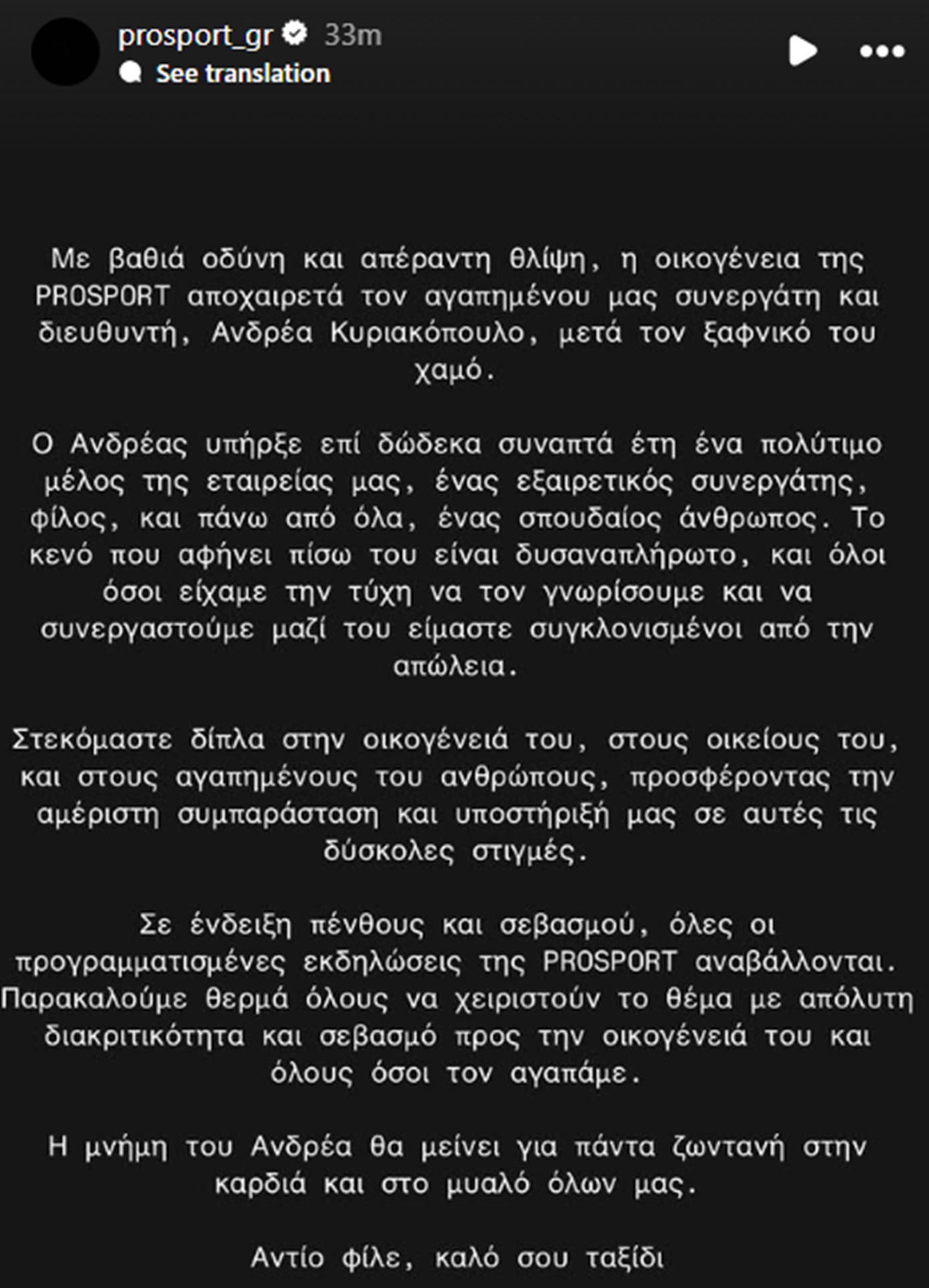 «Με βαθιά οδύνη και απέραντη θλίψη, η οικογένεια της PROSPORT αποχαιρετά τον αγαπημένο μας συνεργάτη και διευθυντή, Ανδρέα Κυριακόπουλο, μετά τον ξαφνικό του χαμό.