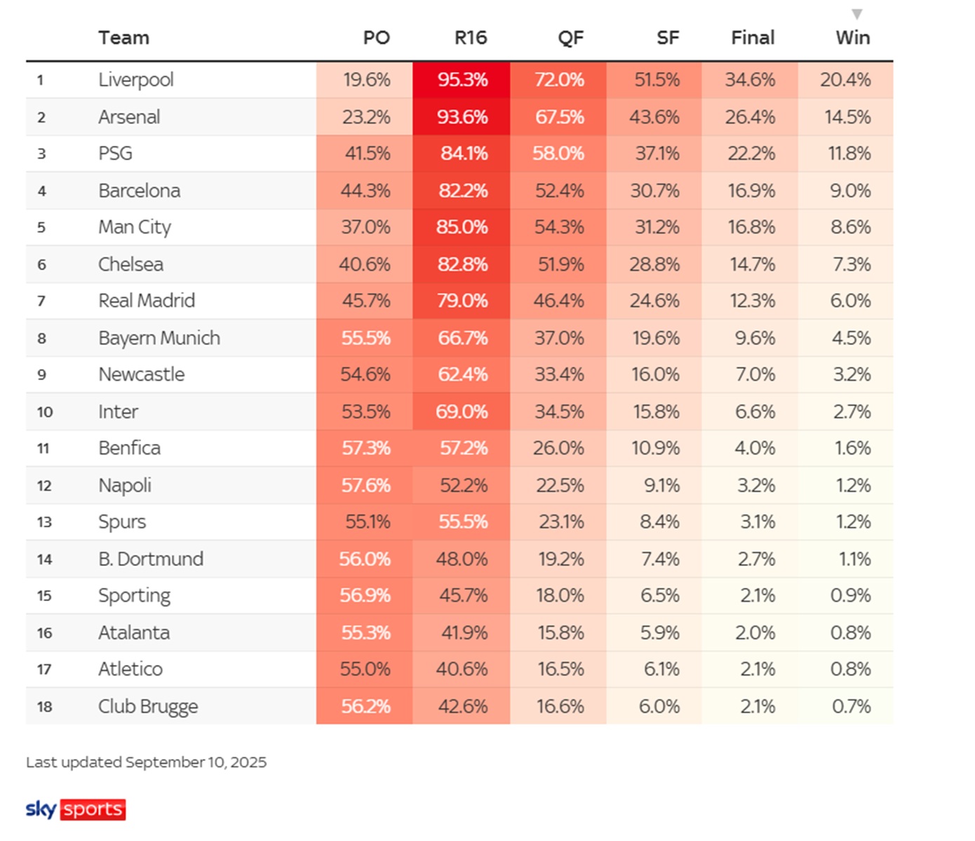 Σύμφωνα με όσα παρουσιάζει το skysports ο υπερυπολογιστής της Opta στρέφει την προσοχή κυρίως στην Premier League. Η Λίβερπουλ θεωρείται το μεγάλο φαβορί με 20,4% πιθανότητες κατάκτησης και εντυπωσιακό 95,3% πιθανότητες πρόκρισης στους «16».