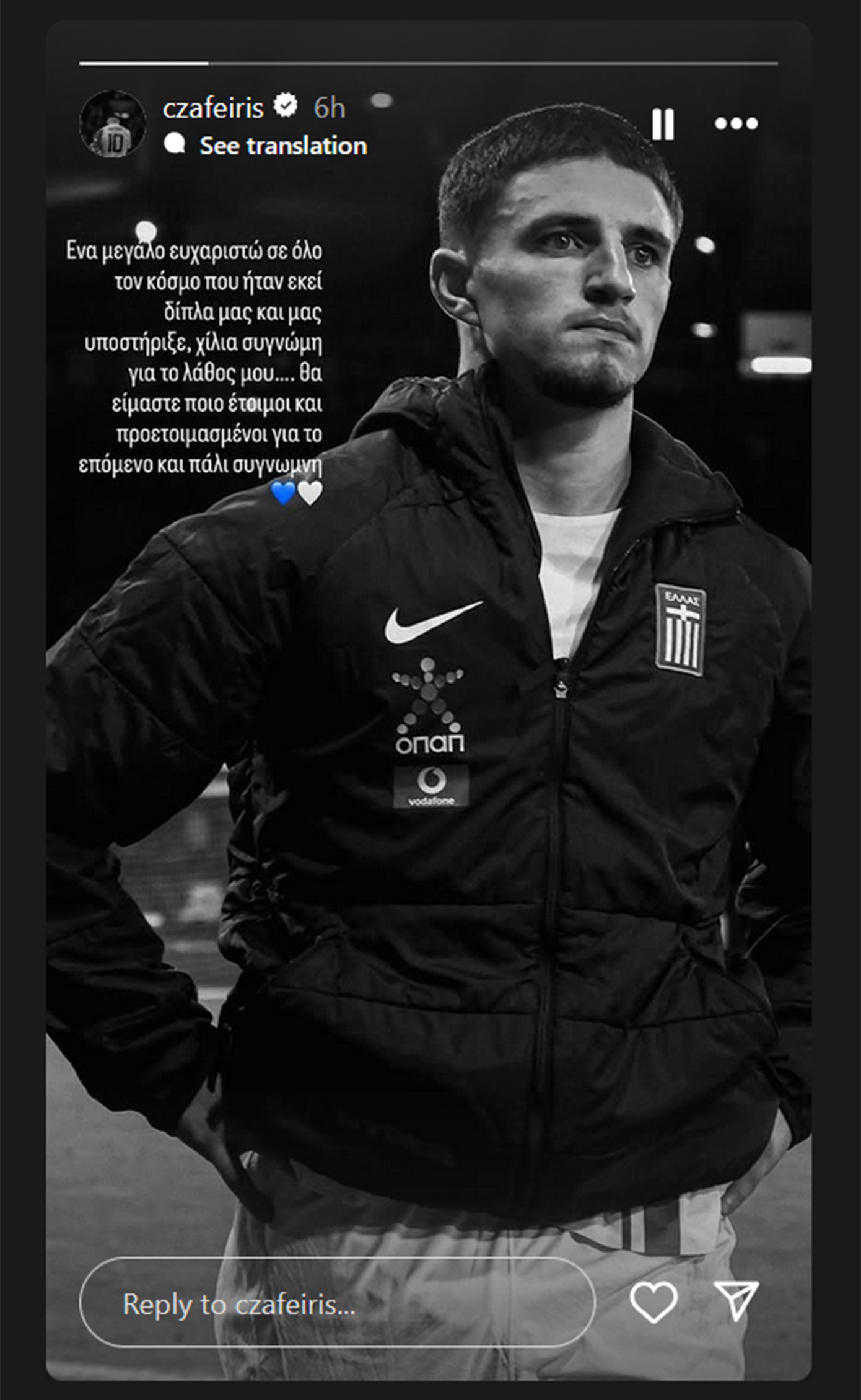 Ο διεθνής μέσος με ανάρτηση του στα μέσα κοινωνικής δικτύωσης απολογήθηκε, ζητώντας συγγνώμη για το λάθος του: «Ένα μεγάλο ευχαριστώ σε όλο τον κόσμο που ήταν εκεί δίπλα μας και μας υποστήριξε, χίλια συγγνώμη για το λάθος μου… Θα είμαστε πιο έτοιμοι και προετοιμασμένοι για το επόμενο και πάλι συγγνώμη», έγραψε στην ανάρτησή του ο Έλληνας διεθνής της Σλάβια Πράγας.