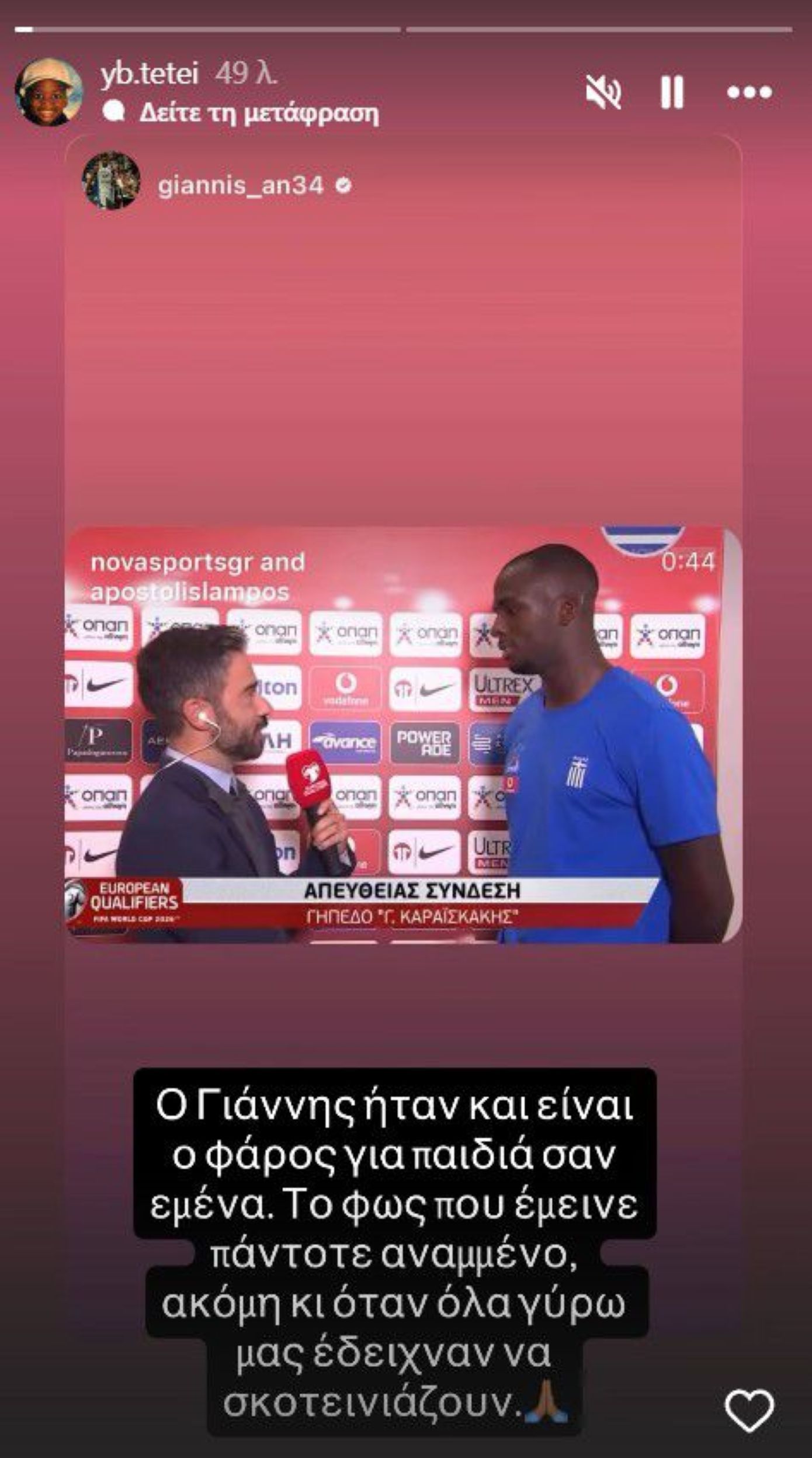 Ο σούπερ σταρ του ΝΒΑ, Γιάννης Αντετοκούνμπο έκανε αρκετά story για τον Ανδρέα Τεττέη που αφορούσαν το ντεμπούτο του στην Εθνική, αλλά και το βραβείο Player Activism με το οποίο τιμήθηκε από την Γενική Συνέλευση της FIFPRO.