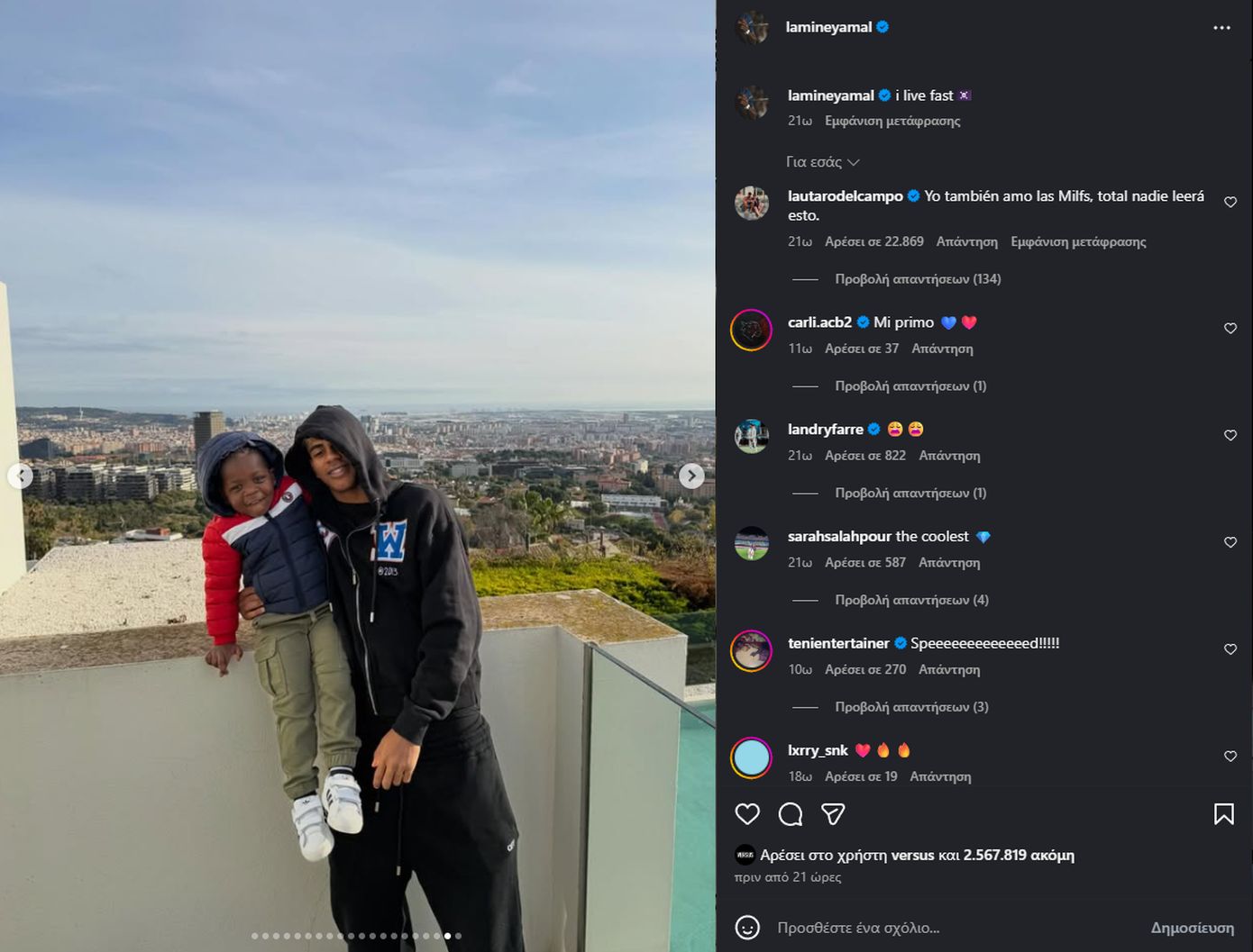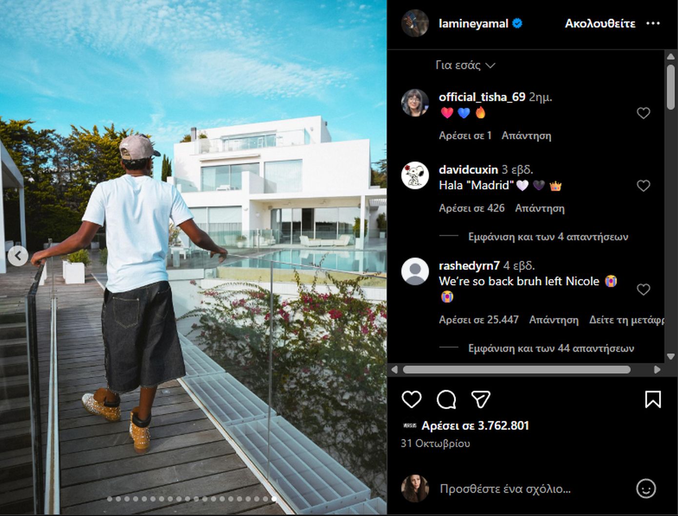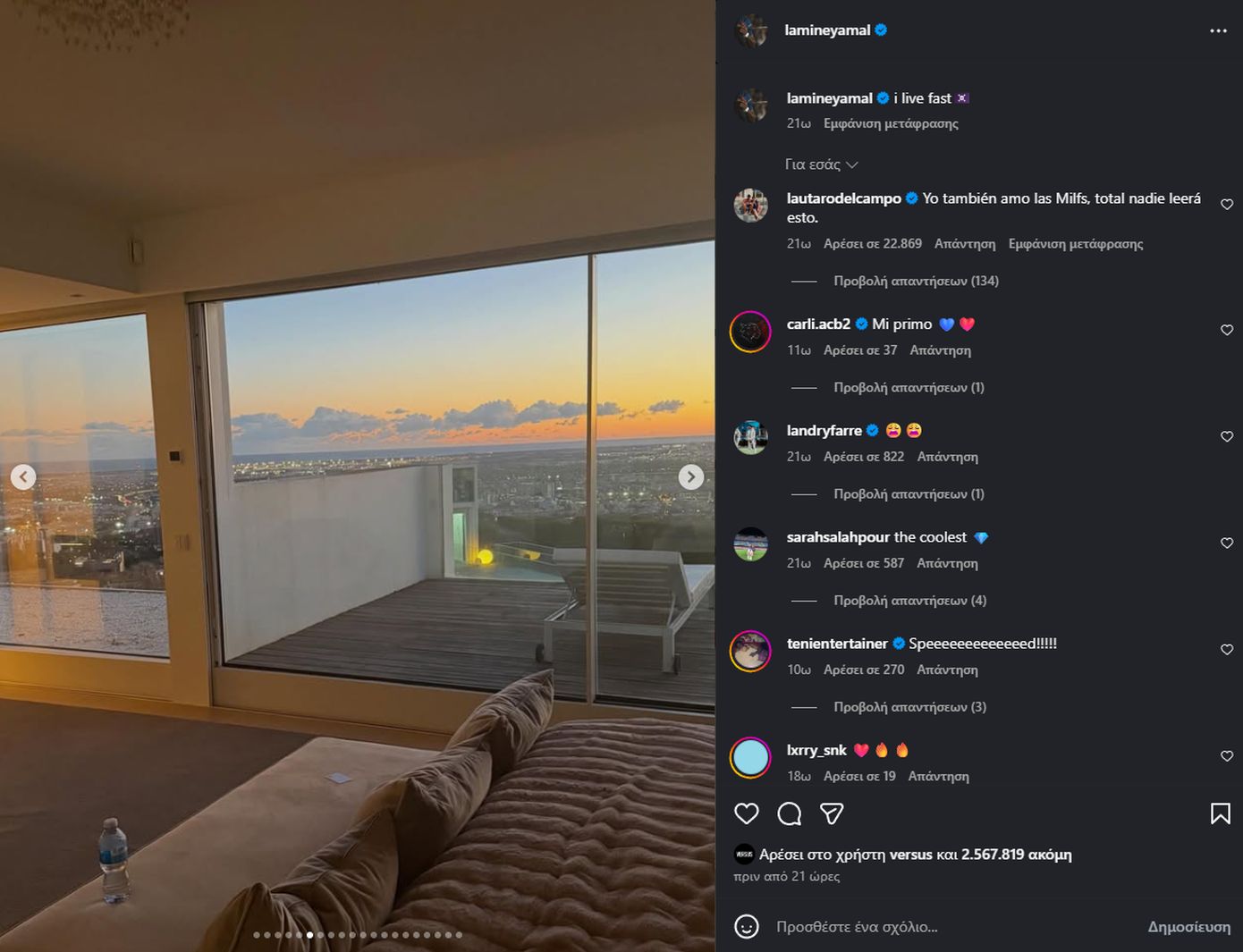 Ο Λαμίν Γιαμάλ δημοσίευσε ένα carousel με στιγμές από την καθημερινότητά του. Ανάμεσα στις φωτογραφίες βρισκόταν και μία που τον δείχνει να ποζάρει μπροστά από την πισίνα της βίλας, έχοντας θέα ολόκληρη τη Βαρκελώνη. Η εικόνα πυροδότησε άμεσα σχόλια και επιβεβαίωσε αυτό που συζητούσε η Ισπανία εδώ και μήνες.