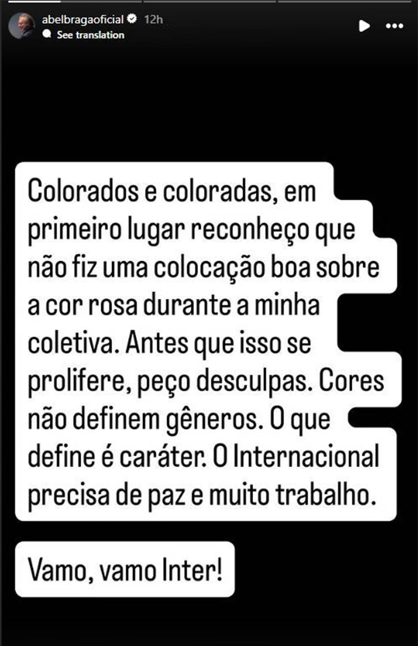 Σύμφωνα με την ιστοσελίδα archivoprisma.com.ar, ο Άμπελ Μπράγκα μετά από λίγες ώρες έκανε story στο Instagram και ζήτησε συγγνώμη για το σχόλιο του, υποστηρίζοντας ότι το παίρνει πίσω.