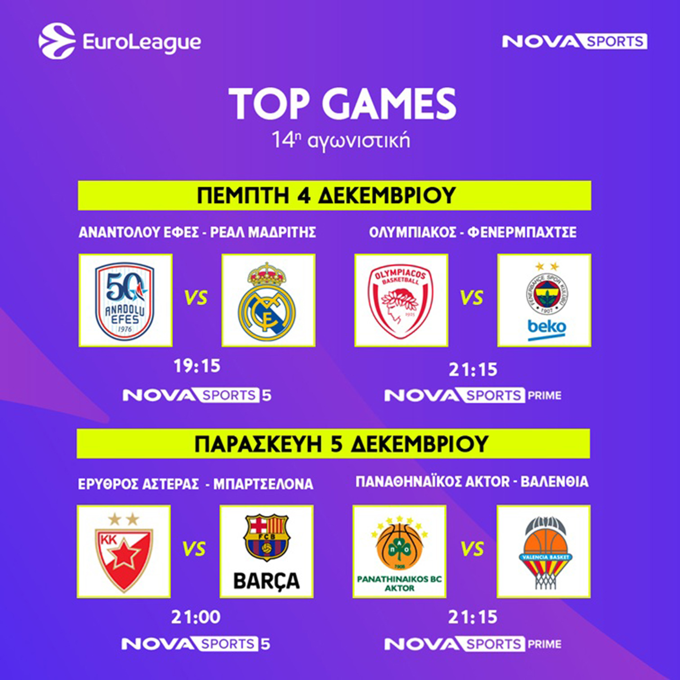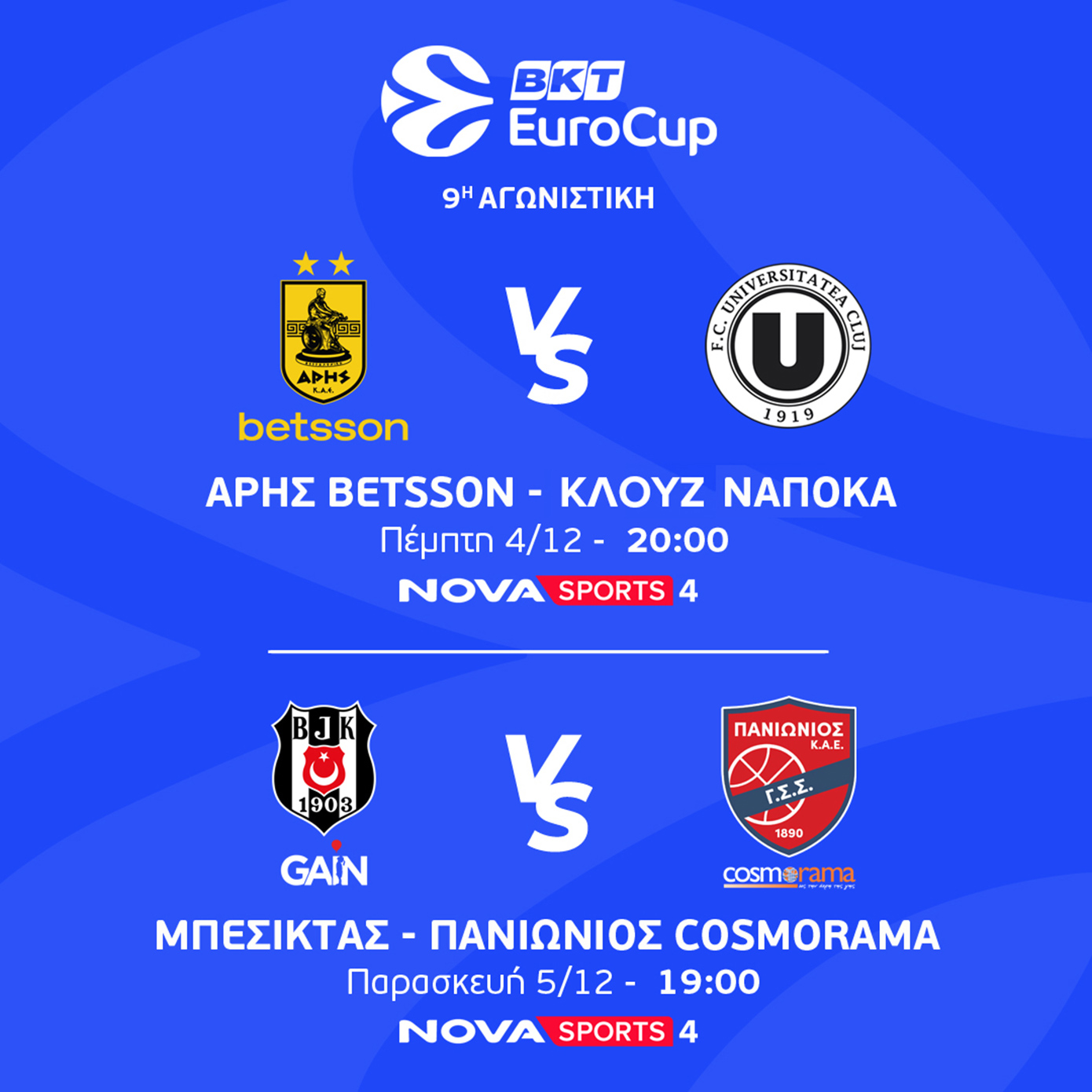 Στο EuroCup με τη διπλή ελληνική εκπροσώπηση, οι ομάδες επιστρέφουν στην αγωνιστική δράση με τη διεξαγωγή της 9ης αγωνιστικής και τις αναμετρήσεις Άρης Betsson-Κλουζ Ναπόκα (4/12, 20:00) και Μπεσίκτας-Πανιώνιος Cosmorama Travel (5/12, 19:00). Παράλληλα, την επόμενη εβδομάδα για την 10η αγωνιστική οι φίλοι του μπάσκετ θα απολαύσουν τους αγώνες Νάινερς Κέμνιτς-Πανιώνιος (9/12, 20:00, Novasports Prime) & Άρης Betsson-Βενέτσια (10/12, 20:00 Novasports Prime), καθώς και τις αναμετρήσεις Μπεσίκτας-Λιετκαμπέλις (9/12, 19:00, Novasports5), Μπουργκ-Τρέντο (9/12, 20:30, Novasports4), Χάποελ Ιερουσαλήμ-Αμβούργο (9/12, 21:00, Novasports Start), Μπουντούτσνοστ-Λόντον Λάιονς (10/12, 20:00, Novasports4), Ουλμ-Άνκαρα (10/12, 20:00, Novasports Start), Μανρέσα-Τσεντεβίτα Ολίμπια (10/12, 21:45, Novasports5).