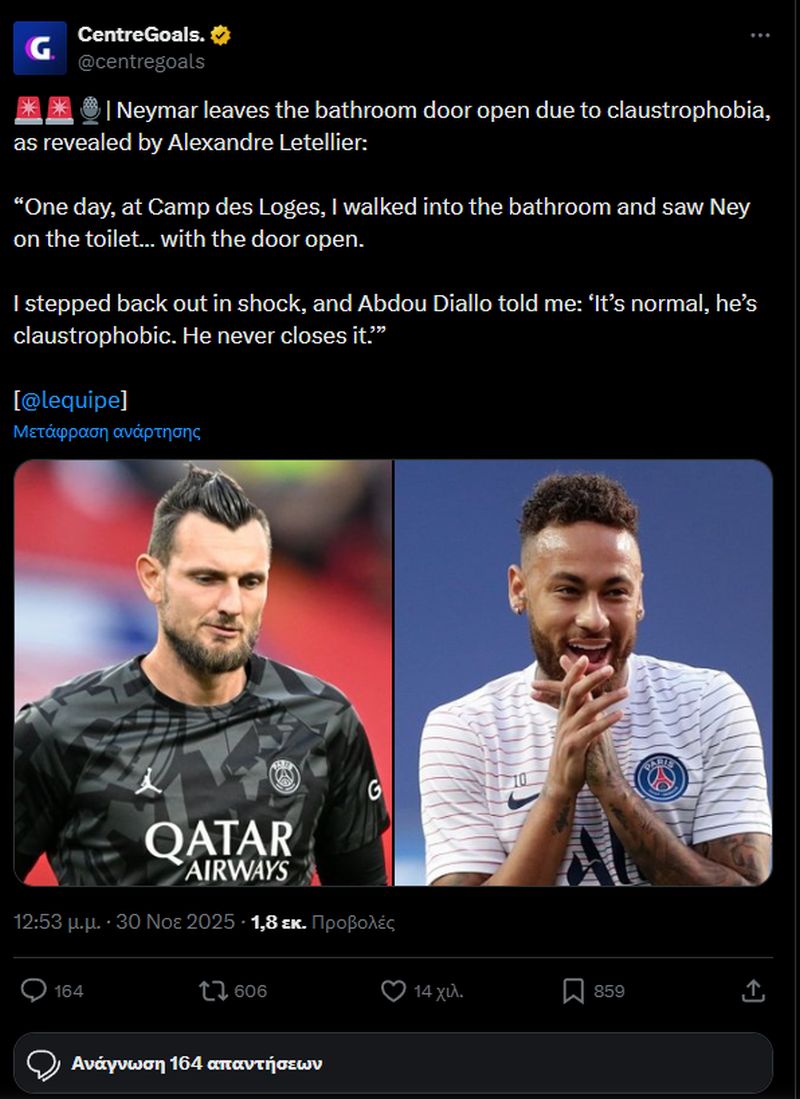 Μια λιγότερο γνωστή και αρκετά ιδιαίτερη πλευρά του Νεϊμάρ αποκαλύπτει πρώην συμπαίκτης του στην Παρί Σεν Ζερμέν, φέρνοντας στο φως μια προσωπική του φοβία που επηρέαζε μέχρι και τις πιο καθημερινές στιγμές του στο προπονητικό κέντρο.