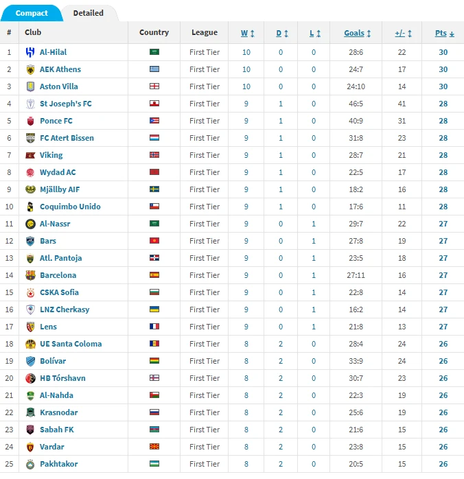 Αμέσως πιο κάτω στη σχετική λίστα βρίσκονται ομάδες όπως η Άστον Βίλα, η Μπαρτσελόνα, η Αλ Νασρ και η Βίκινγκ, αλλά και σύλλογοι με εντυπωσιακές πορείες σε πρωταθλήματα που παραδοσιακά θεωρούνται κορυφαία.