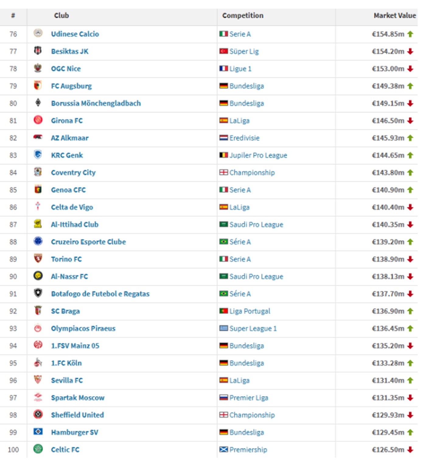 Οι «ερυθρόλευκοι» κατόρθωσαν να βρεθούν στην 93η θέση της λίστας, με την αξία τους να κινείται ανοδικά αυτή τη χρονιά και να φτάνει τα 136,45 εκατ. ευρώ. Το όριο για να μπει μία ομάδα στη λίστα ήταν τα 126,5 εκατ. της Σέλτικ.