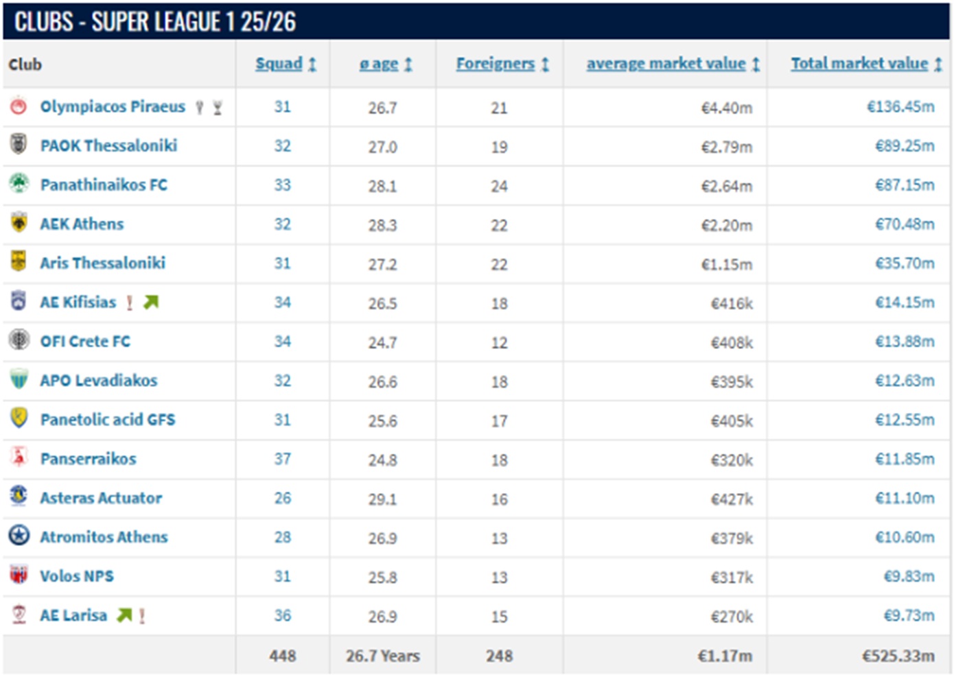 Όσον αφορά τις υπόλοιπες ελληνικές ομάδες, εκείνες απείχαν αρκετά από τα νούμερα αυτά. Ο ΠΑΟΚ ήταν δεύτερος στην Ελλάδα με 89,25 εκατ. ευρώ, κοντά του και ο τρίτος Παναθηναϊκός με 87,15 εκατ. και στην τέταρτη θέση η ΑΕΚ με 70,48 εκατ.