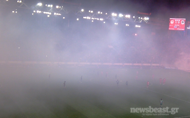 Με το γκολ του Μιραλάς στο 20ο λεπτό προηγείται ο Ολυμπιακός στο ημίχρονο του μεγάλου ντέρμπι των «αιωνίων». Μετά το 1-0 έγινε διακοπή λόγω των καπνογόνων και έγινε έκκληση από τα μεγάφωνα να σταματήσει η ρίψη βεγγαλικών.