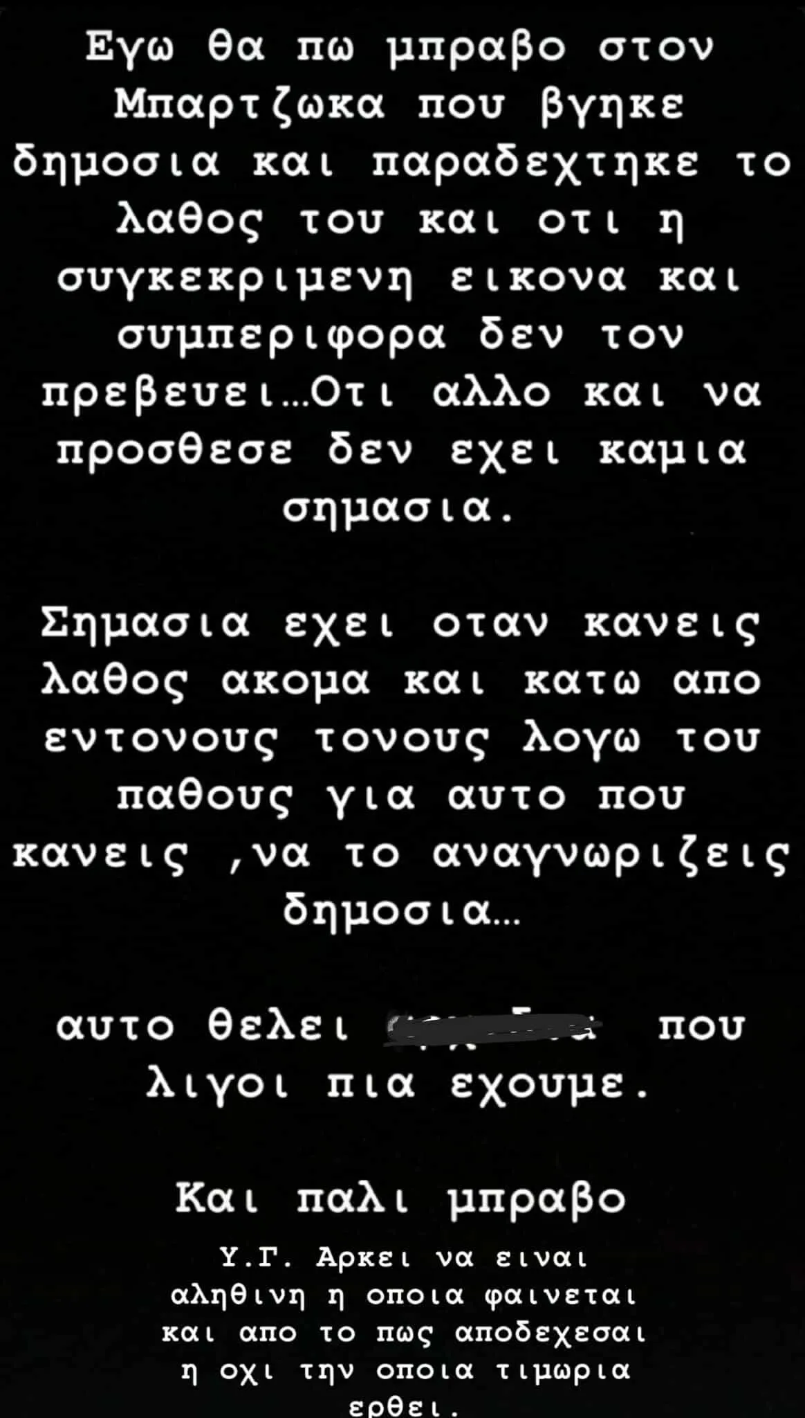 «Εγώ θα πω μπράβο στον Μπαρτζώκα που βγήκε δημόσια και παραδέχτηκε το λάθος του και ότι η συγκεκριμένη εικόνα και συμπεριφορά δεν τον πρεσβεύει… Ό,τι άλλο και να πρόσθεσε δεν έχει καμία σημασία.