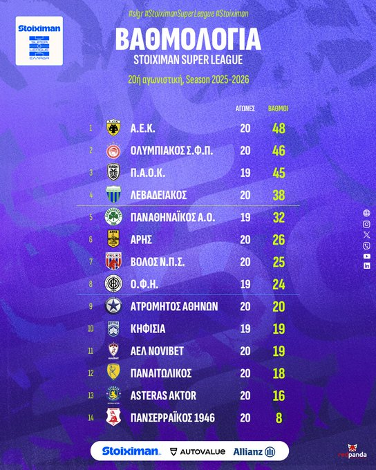 Η ολοκλήρωση της τελευταίας αγωνιστικής έφερε την ΑΕΚ μόνη πρώτη στη βαθμολογία, με την ομάδα του Μάρκο Νίκολιτς να έχει μπροστά της ένα απαιτητικό ταξίδι στη Θεσσαλονίκη. Την ερχόμενη Κυριακή (15/2, 19:30) θα τεθεί αντιμέτωπη με τον ΠΑΟΚ στην Τούμπα, σε ένα ντέρμπι υψηλής έντασης που ενδέχεται να αλλάξει εκ νέου τις ισορροπίες στην κορυφή. Την ίδια ώρα, ο Ολυμπιακός αγωνίζεται στη Λιβαδειά, σε αναμέτρηση ιδιαίτερης σημασίας για την ομάδα του Χοσέ Λουίς Μεντιλίμπαρ, η οποία θέλει να επιστρέψει στην πρώτη θέση.