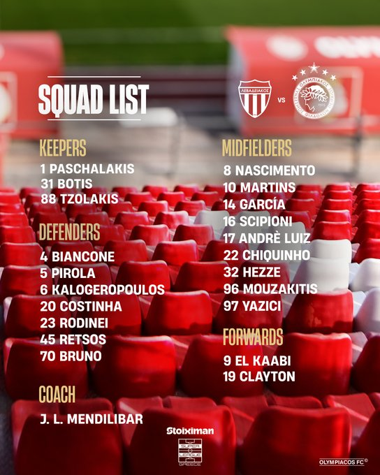 Ο Χοσέ Λουίς Μεντιλίμπαρ γνωστοποίησε την αποστολή του Ολυμπιακού για την αναμέτρηση με τον Λεβαδειακό στη Βοιωτία (14/2, 19:30).