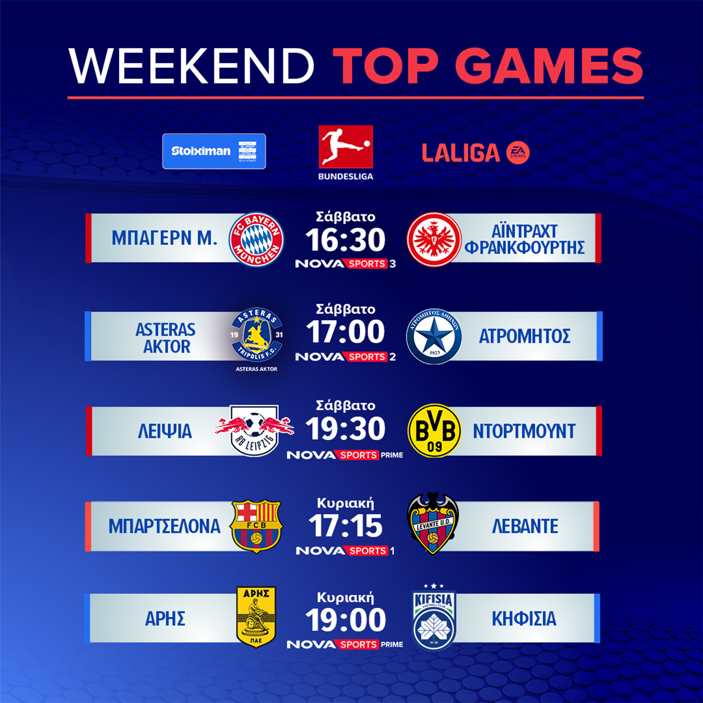 Πανδαισία από τα γήπεδα της Ελλάδας και της Ευρώπης, περιμένει τους συνδρομητές της Nova και αυτή την εβδομάδα μέσα από το ασυναγώνιστο μπουκέτο αθλητικού περιεχομένου που περιλαμβάνει όλα τα αθλητικά γεγονότα των καναλιών Novasports και Cosmote Sport, όλα στην πλατφόρμα EON!