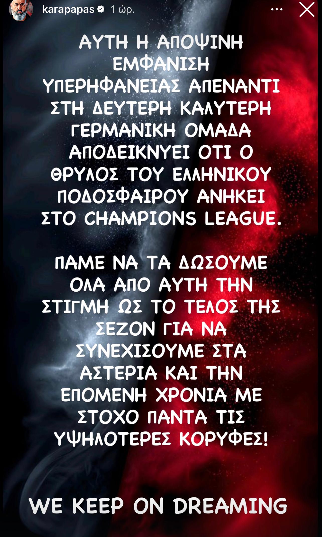Στο ίδιο μήκος κύματος κινήθηκε και το μήνυμα του Κώστα Καραπαπά μετά τον αποκλεισμό. Ο αντιπρόεδρος της ΠΑΕ Ολυμπιακός εξέφρασε την υπερηφάνειά του για την προσπάθεια και την εικόνα της ομάδας, τονίζοντας πως αυτή η πορεία αποτελεί παρακαταθήκη για το μέλλον. Παράλληλα, έστειλε το σύνθημα για συσπείρωση και απόλυτη συγκέντρωση στους εγχώριους στόχους, με πρώτο το πρωτάθλημα. Γιατί πάνω απ’ όλα, αυτή η ομάδα απέδειξε ότι δεν συμμετέχει απλώς στο Champions League. Ανήκει εκεί.